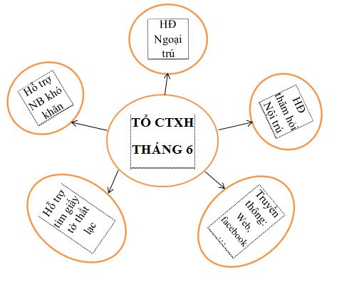 Trong tháng 6, Tổ Công tác xã hội (CTXH) bên cạnh hoạt động hỗ trợ khám chữa bệnh Ngoại trú, tìm giấy tờ thất lạc, còn tích cực đẩy mạnh thăm hỏi NB Nội trú, hỗ trợ NB có hoàn cảnh khó khăn, truyền thông hình ảnh, thông tin về Tổ, trong đó nổi bật là lập trang Facebook. Cụ thể các hoạt động được mô tả qua sơ đồ sau: