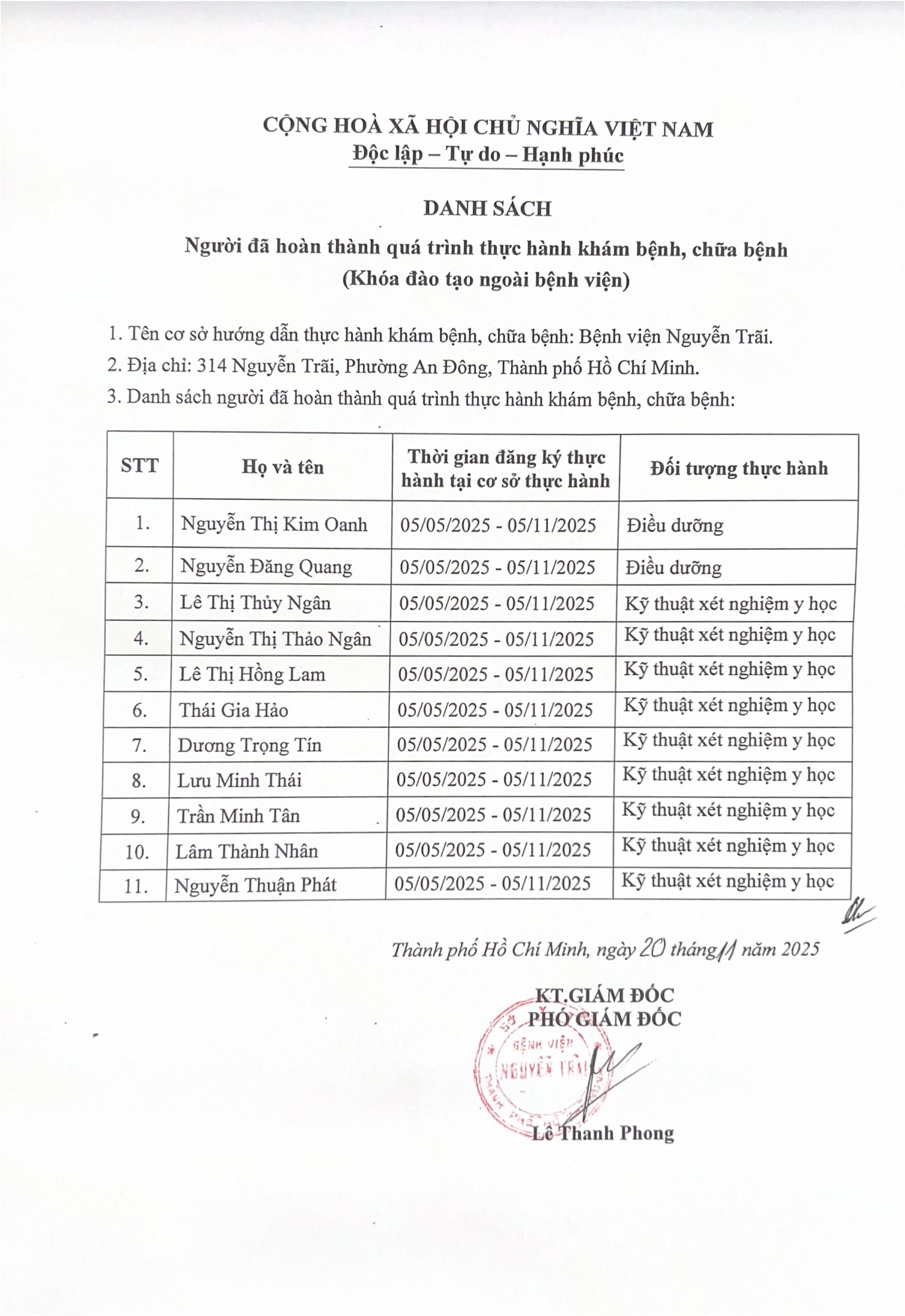 Danh sách người đã hoàn thành quá trình thực hành khám bệnh, chữa bệnh (Khoá đào tạo ngoài bệnh viện)