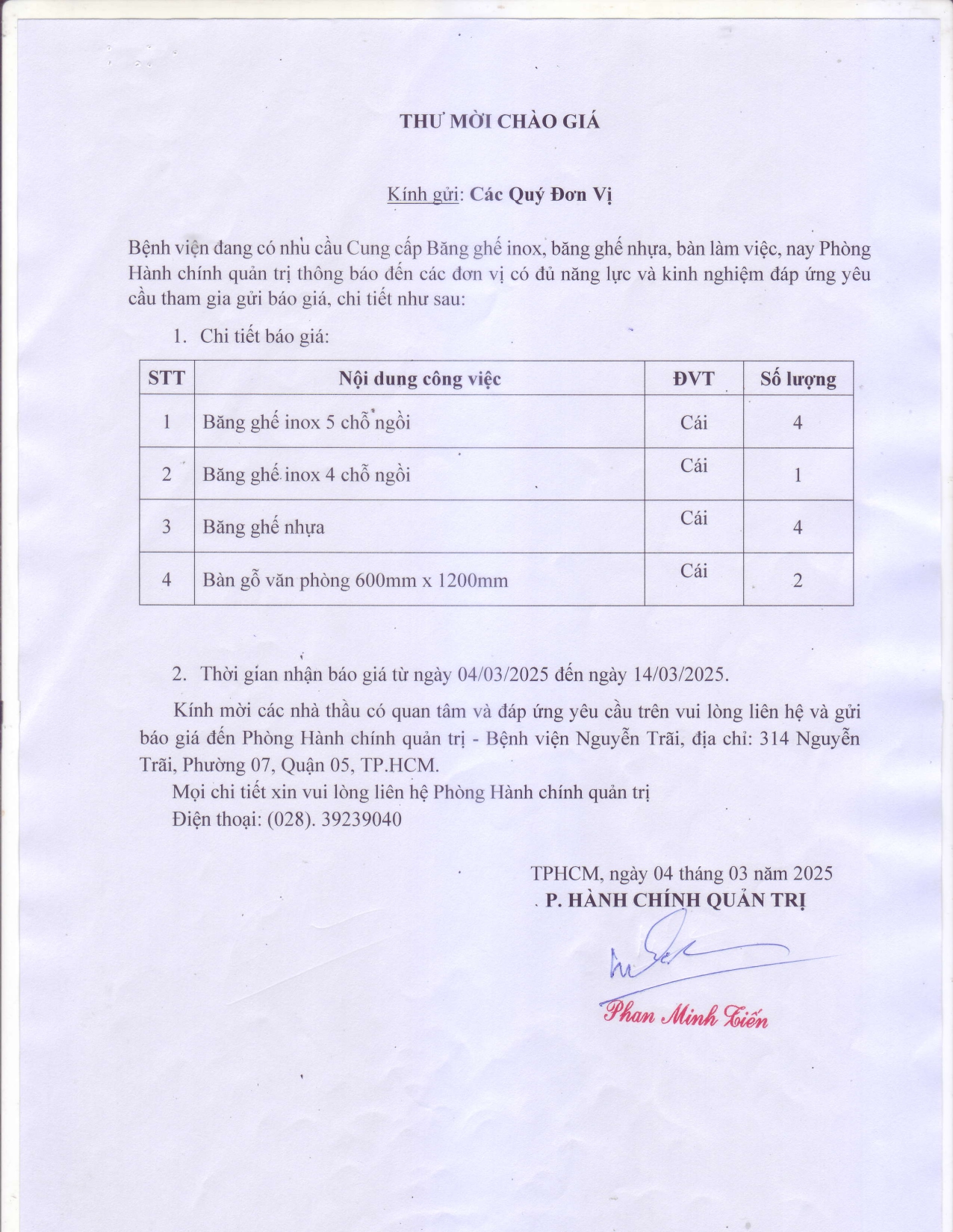 Thư mời chào giá băng ghế inox, băng ghế nhựa, bàn làm việc
