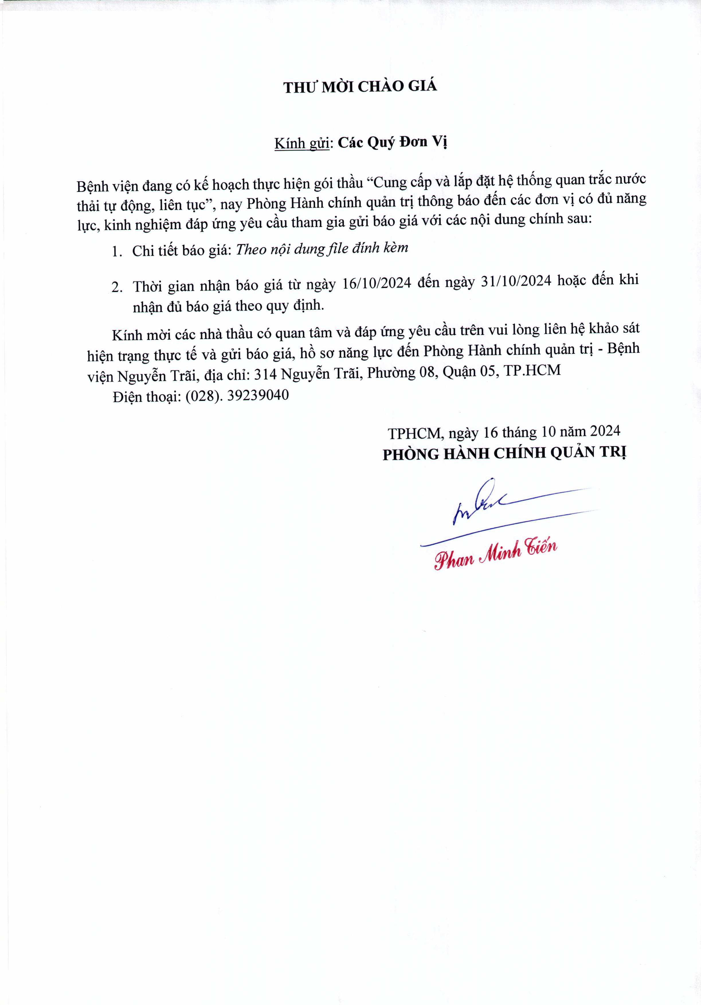 Thư mời chào giá Bệnh viện đang có kế hoạch thực hiện gói thầu “Cung cấp và lắp đặt hệ thống quan trắc nước thải tự động, liên tục”