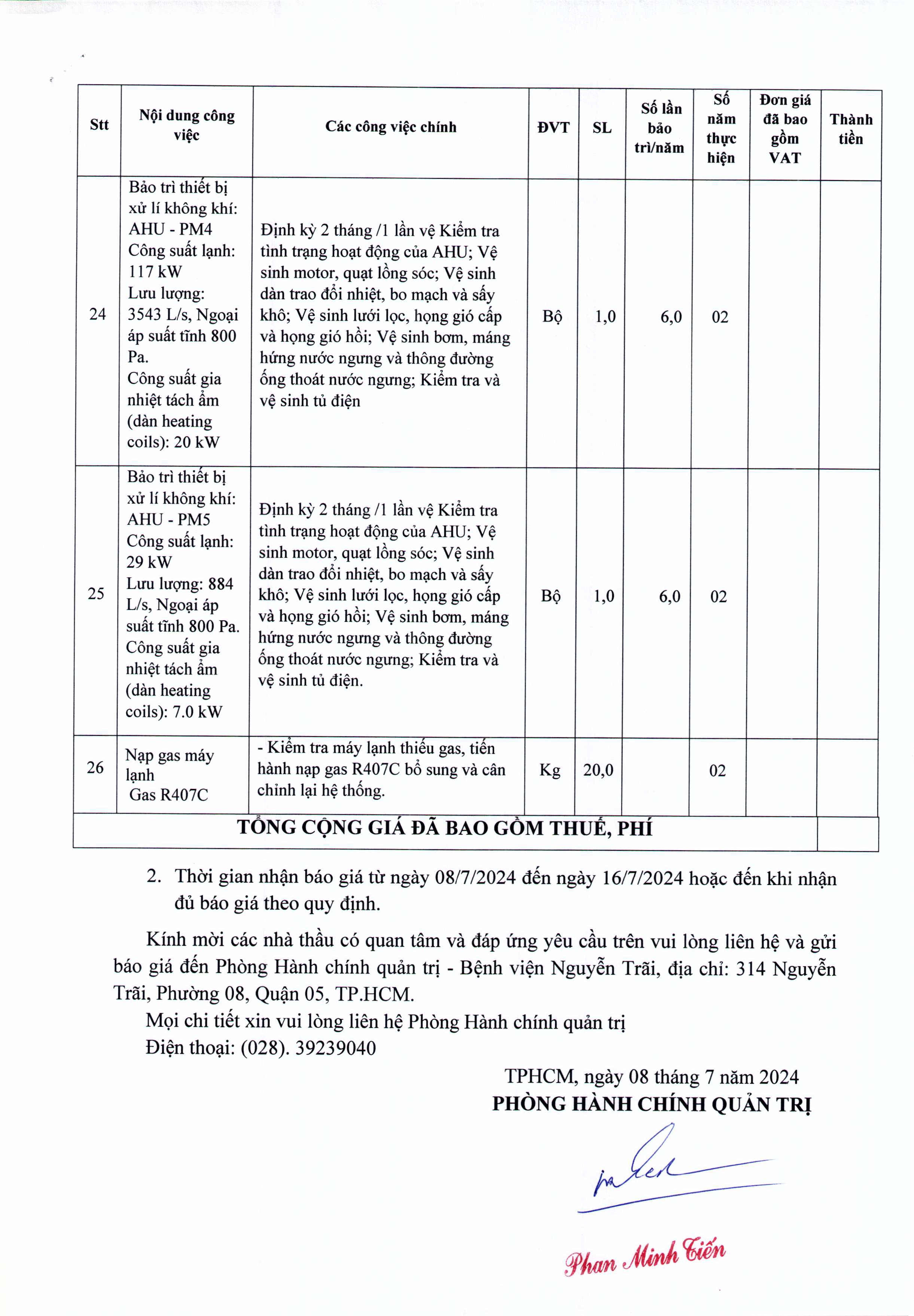 Thư mời chào giá Bệnh viện đang có nhu cầu bảo trì, vệ sinh hệ thống điều hoà không khí năm 2024-2025 (lần 2)