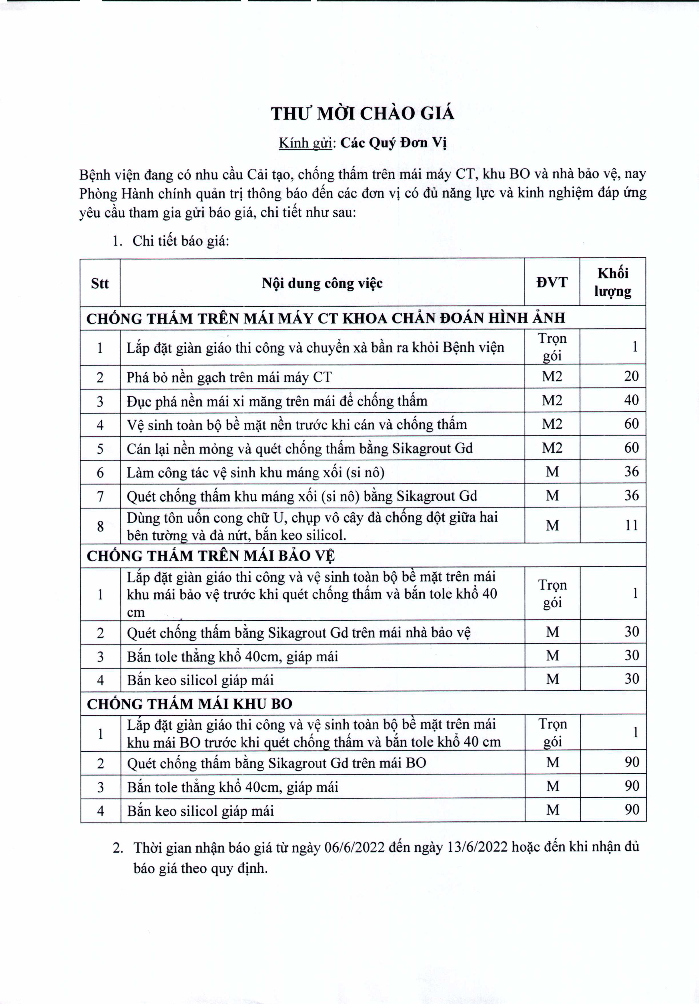 Thư mời chào giá Bệnh viện đang có nhu cầu cải tạo, chống thấm trên mái máy CT, khu BO và nhà bảo vệ