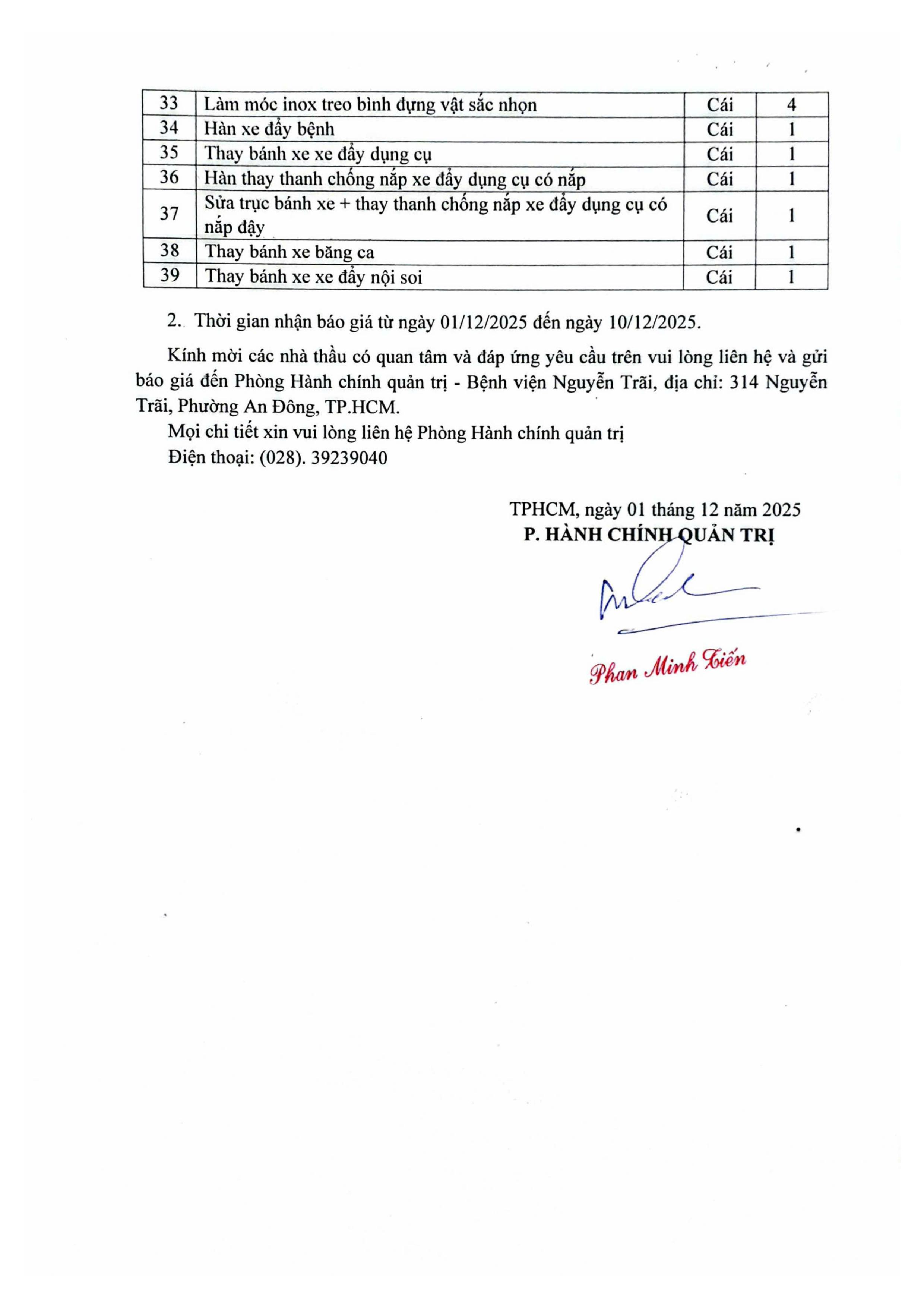 Invitation to submit a quotation. The hospital is seeking welding and repair services for beds, stretchers, cabinets, and various types of carts for its departments.