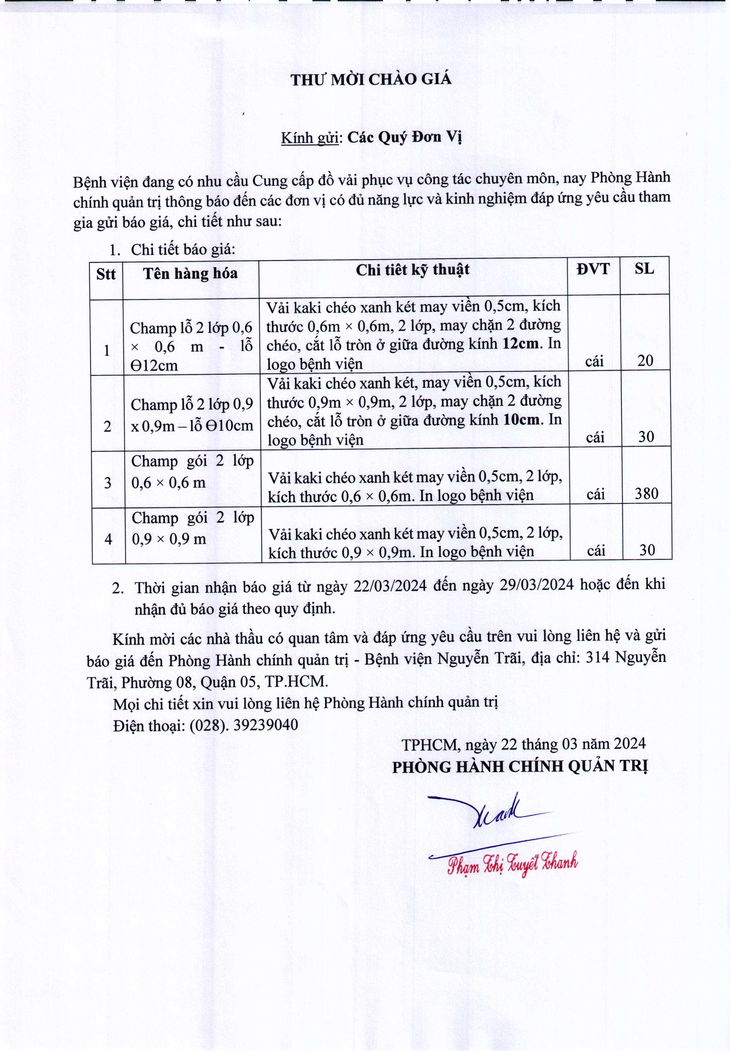 Thư mời chào giá Bệnh viện đang có nhu cầu Cung cấp đồ vải phục vụ công tác chuyên môn