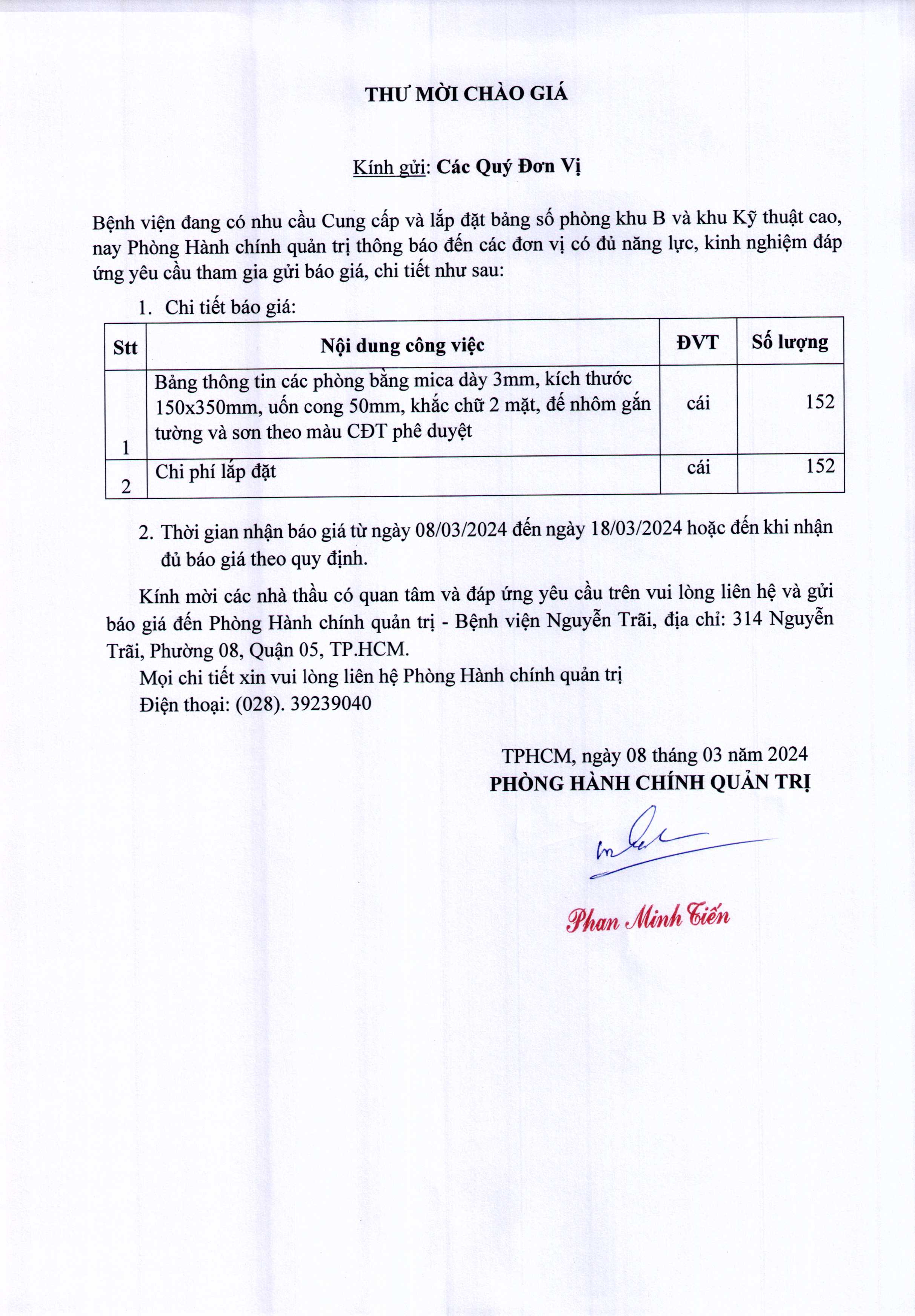 Thư mời chào giá Bệnh viện đang có nhu cầu Cung cấp và lắp đặt bảng số phòng khu B và khu Kỹ thuật cao