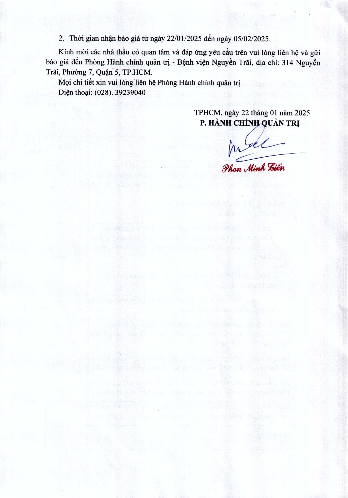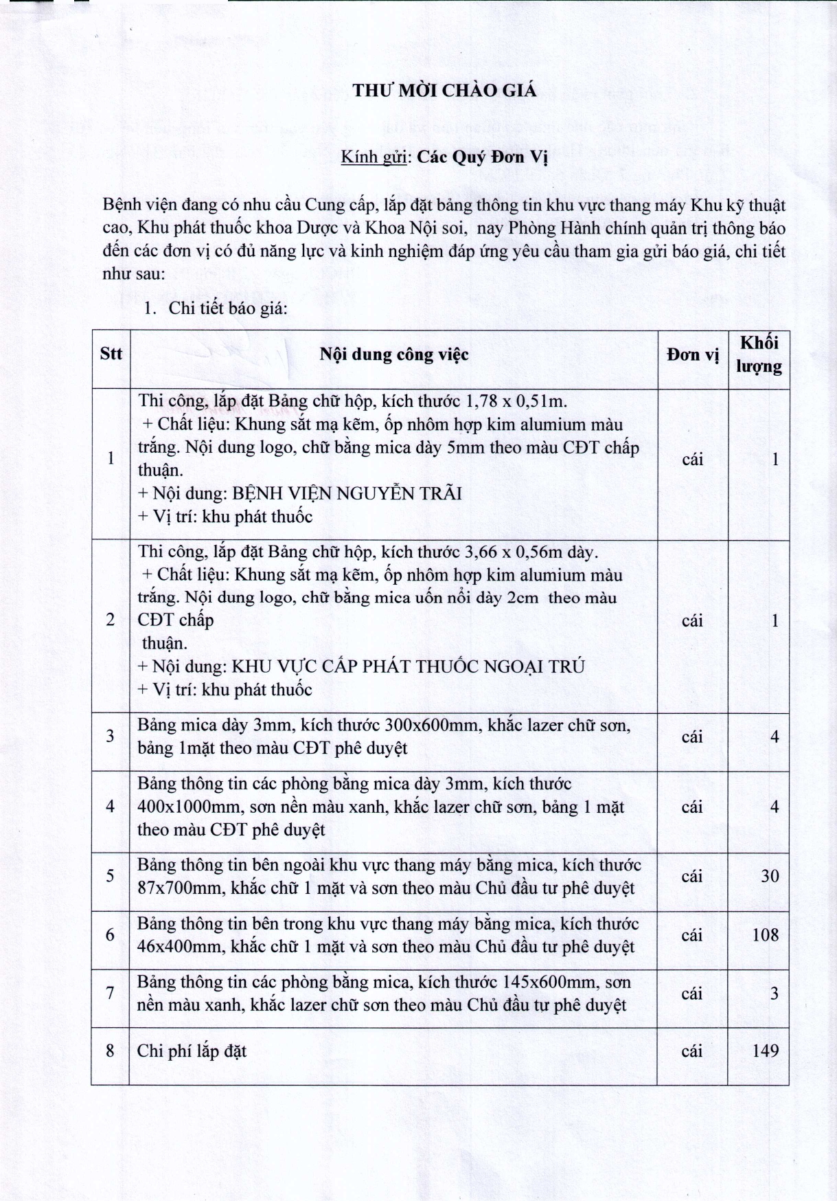 Thư mời chào giá Bệnh viện đang có nhu cầu lắp đặt bảng thông tin khu vực thang máy Khu kỹ thuật cao, khu phát thuốc khoa Dược, và khoa Nội soi