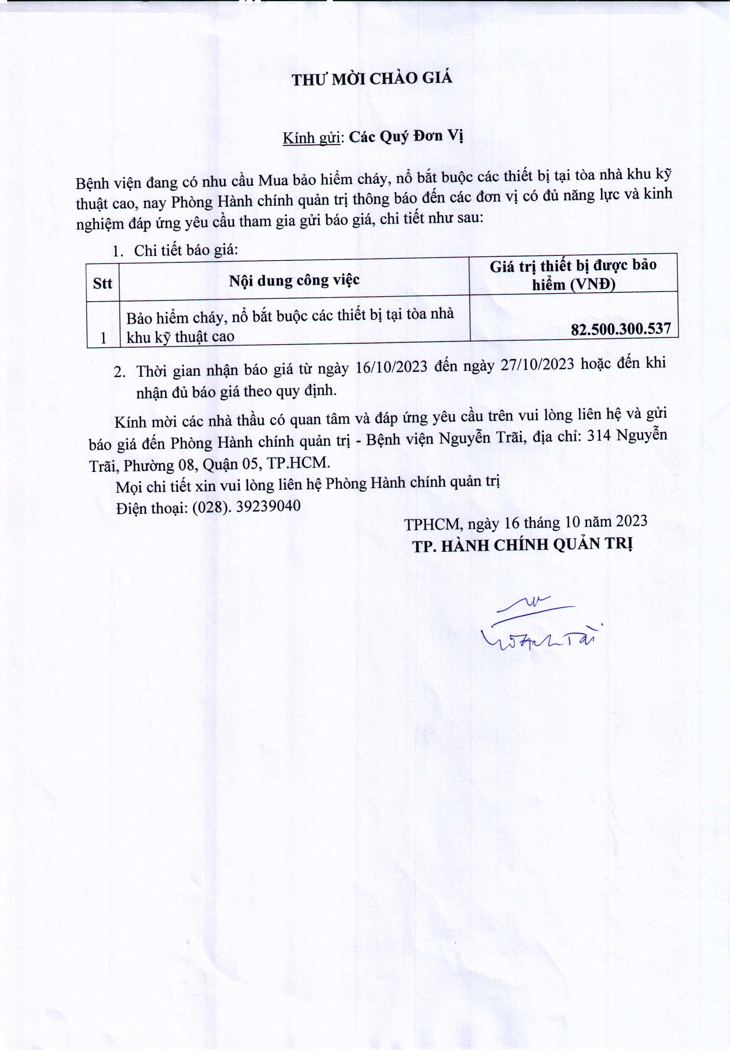 Thư mời chào giá Bệnh viện đang có nhu cầu mua bảo hiểm cháy,nổ bắt buộc các thiết bị tại tòa nhà khu Kỹ thuật cao