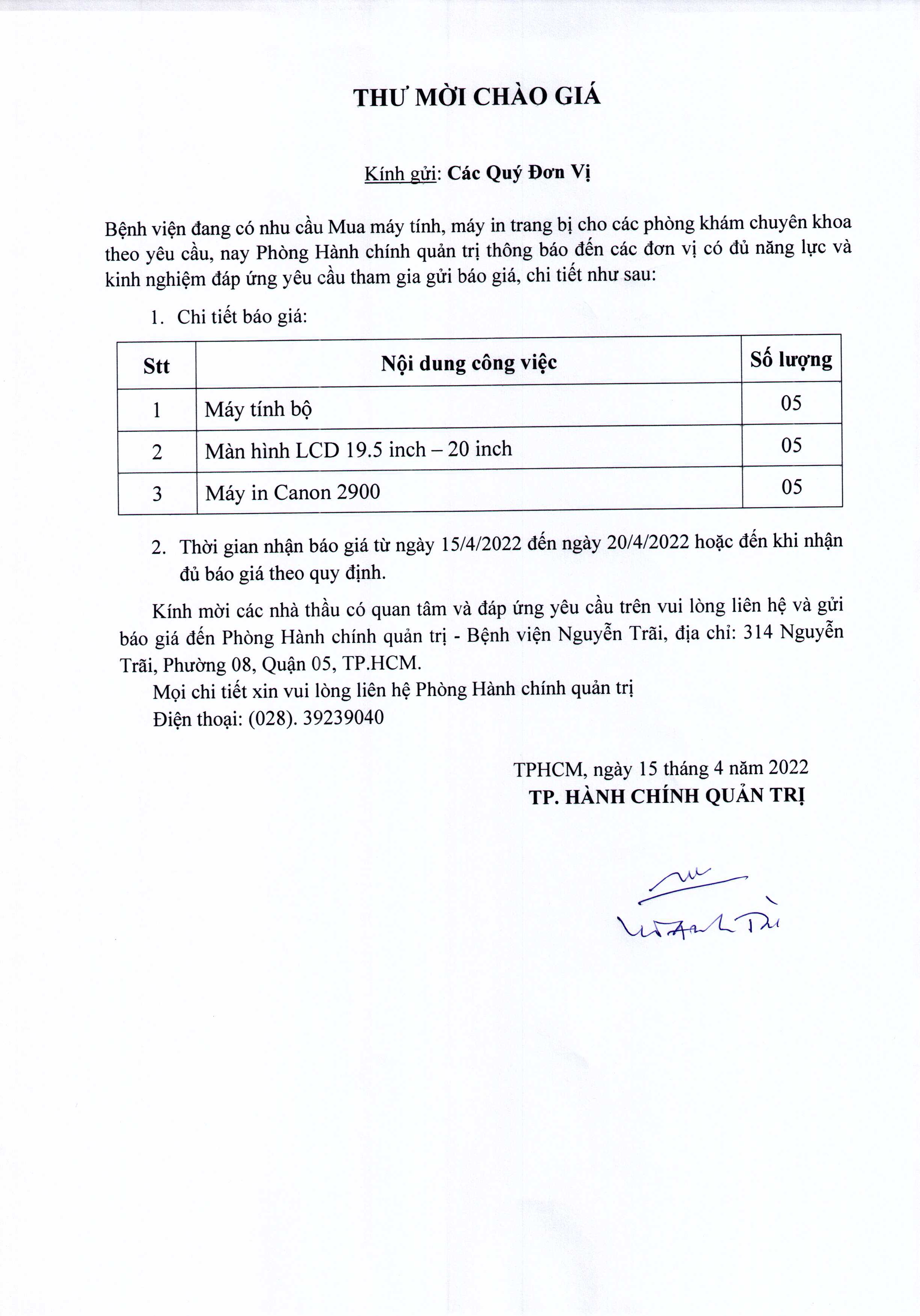 Thư mời chào giá Bệnh viện đang có nhu cầu mua máy tính, máy in trang bị cho các phòng khám chuyên khoa theo yêu cầu