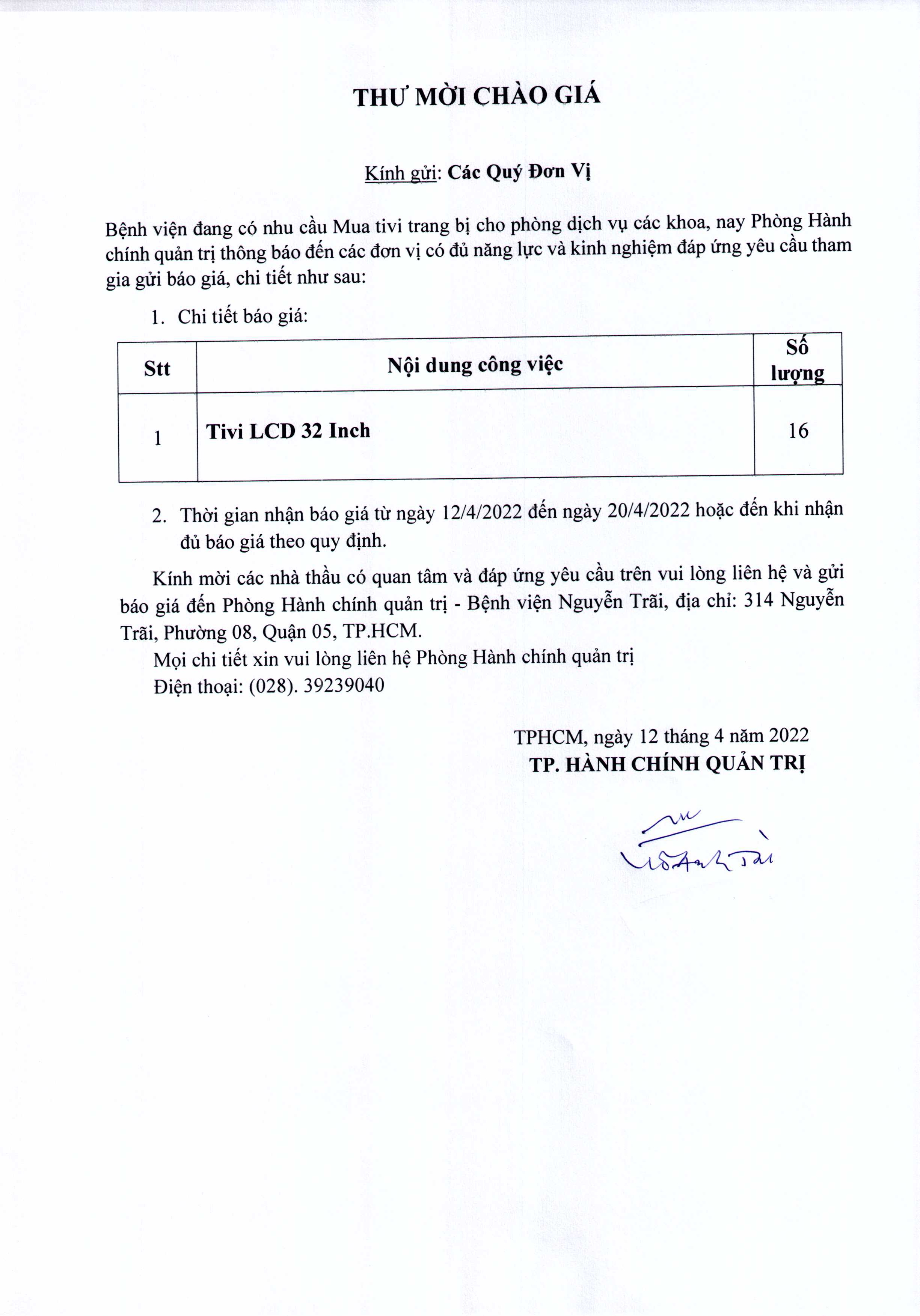 Thư mời chào giá Bệnh viện đang có nhu cầu mua tivi trang bị cho phòng dịch vụ các khoa