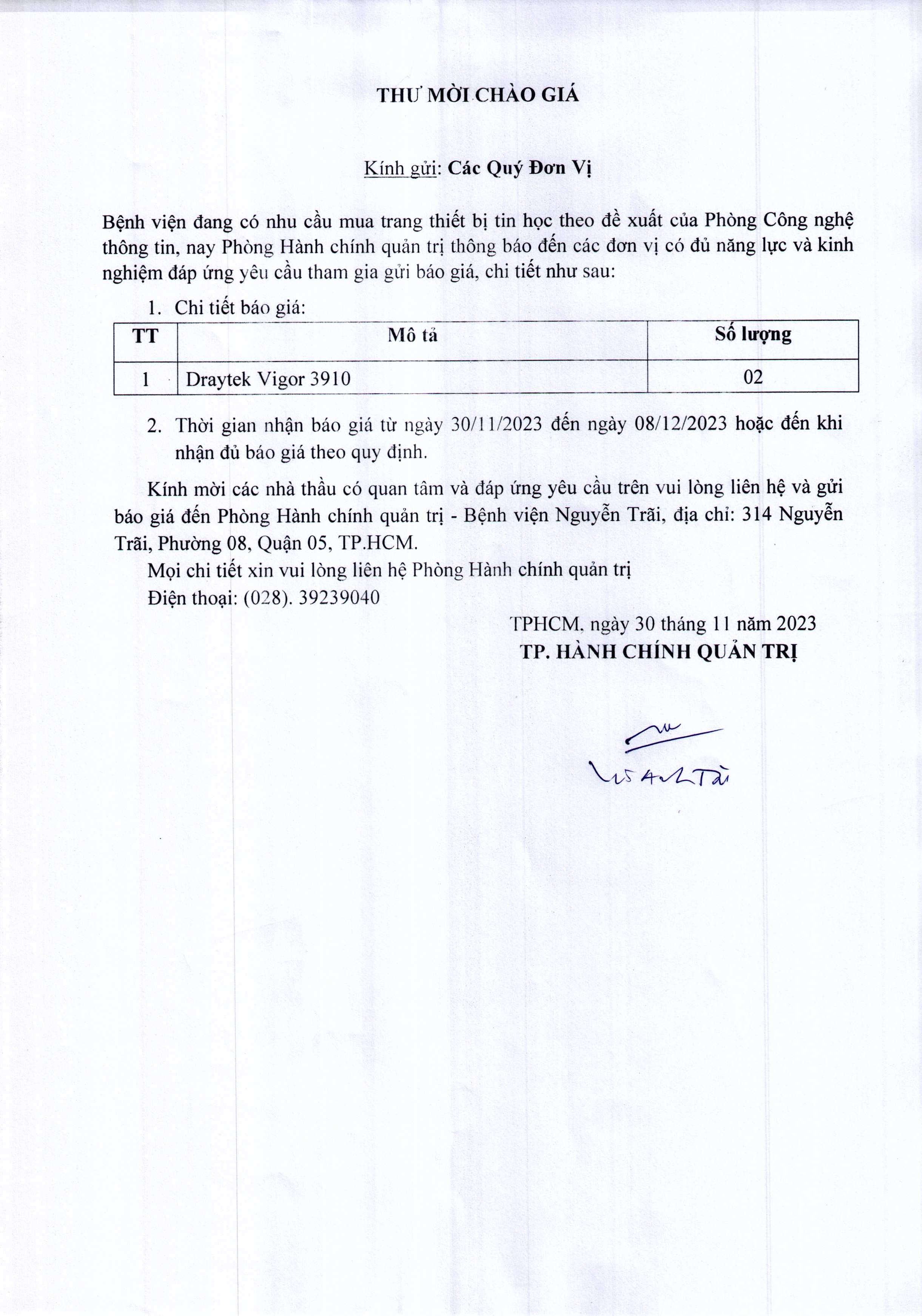 Thư mời chào giá Bệnh viện đang có nhu cầu mua trang thiết bị tin học theo đề xuất của Phòng Công nghệ thông tin