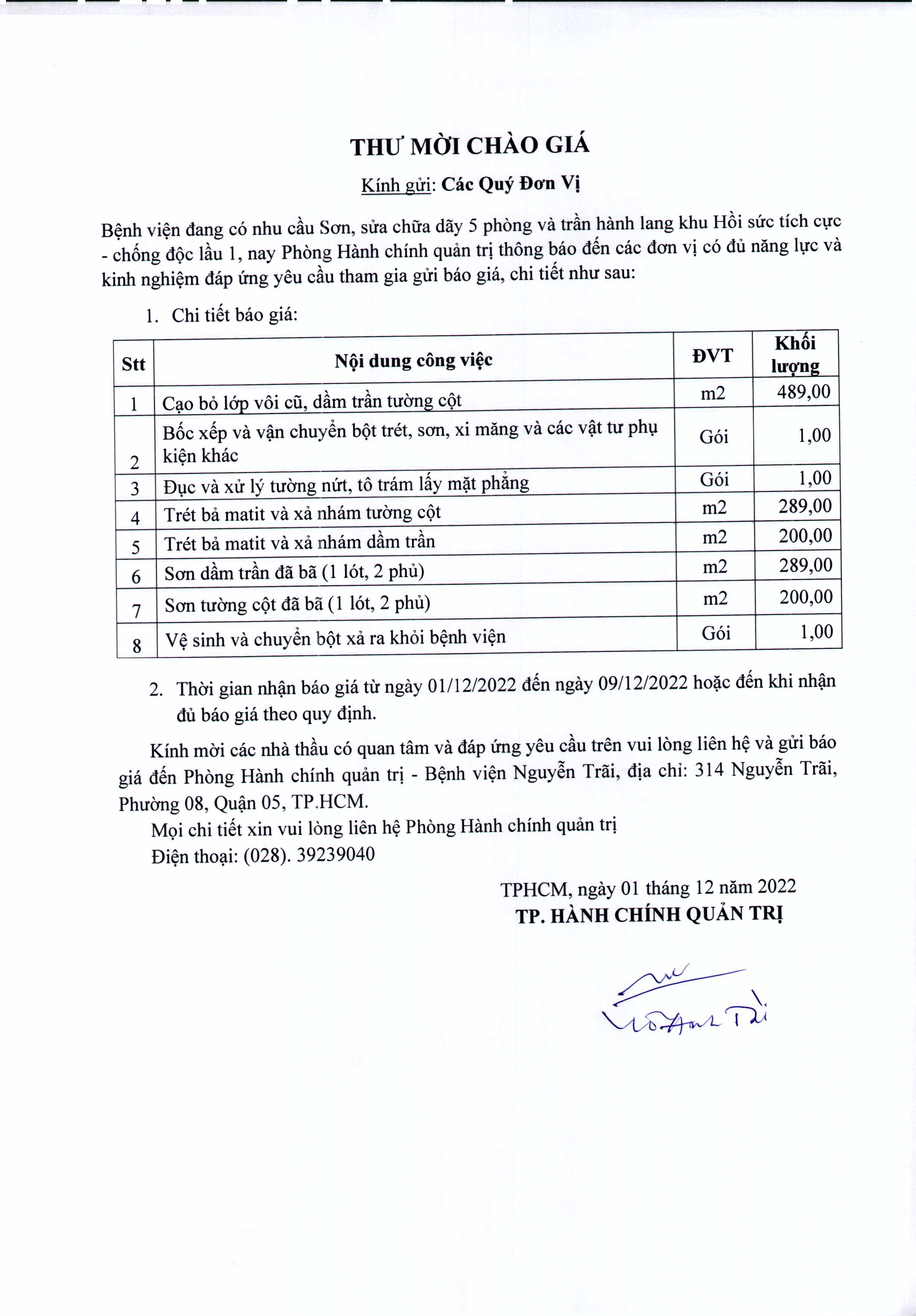 Thư mời chào giá Bệnh viện đang có nhu cầu sơn, sửa chữa dãy 5 phòng và trần hành lang khu Hồi sức tích cực – chống độc lầu 1