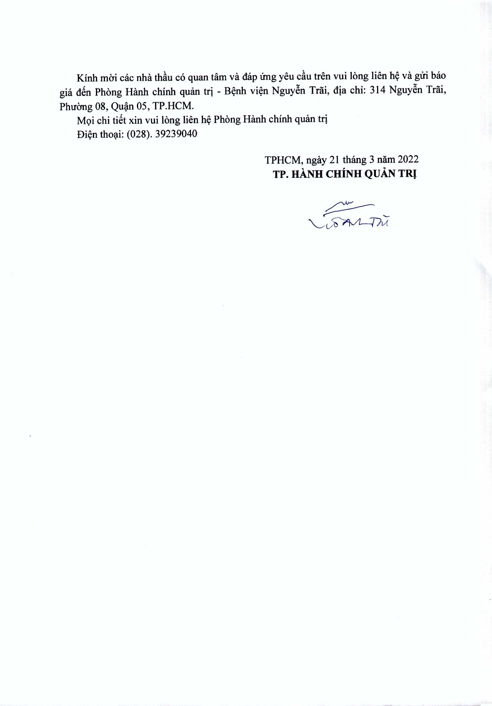 Thư mời chào giá Bệnh viện đang có nhu cầu sửa chữa, cải tạo 4 phòng tầng trệt khu D