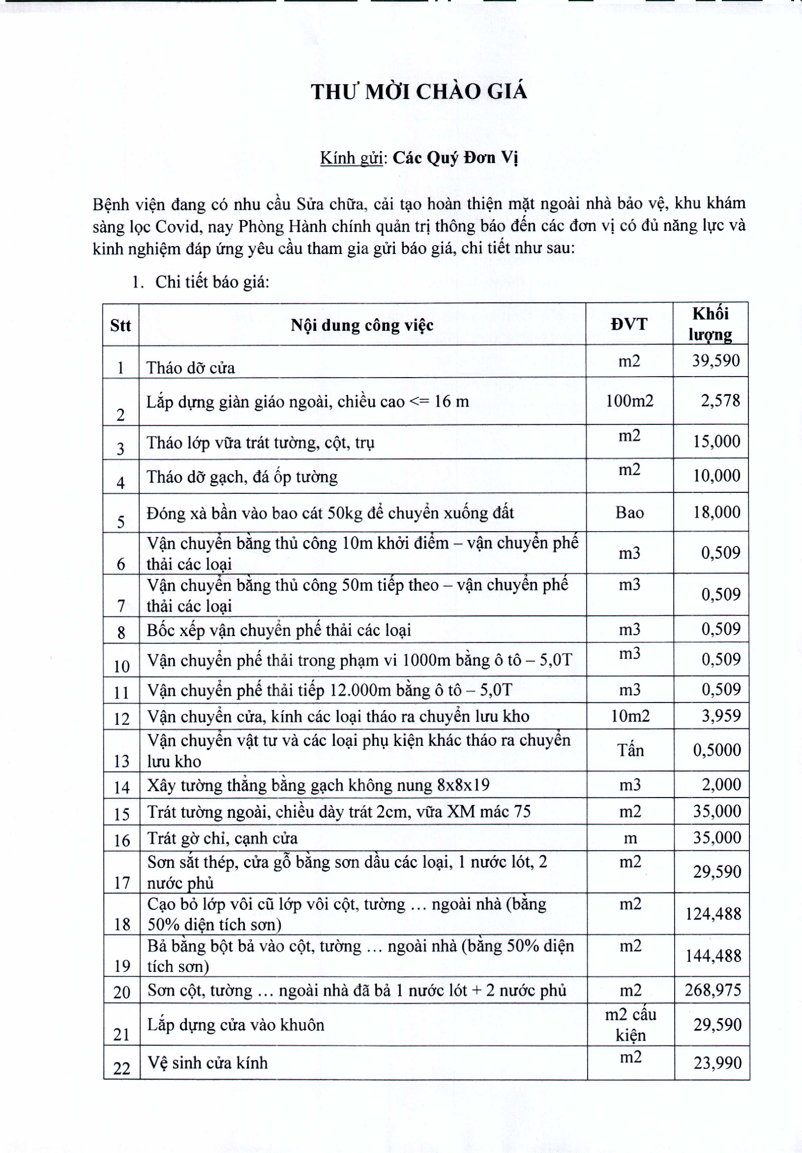 Thư mời chào giá Bệnh viện đang có nhu cầu sửa chữa, cải tạo hoàn thiện mặt ngoài nhà bảo vệ, khu khám sàng lọc Covid