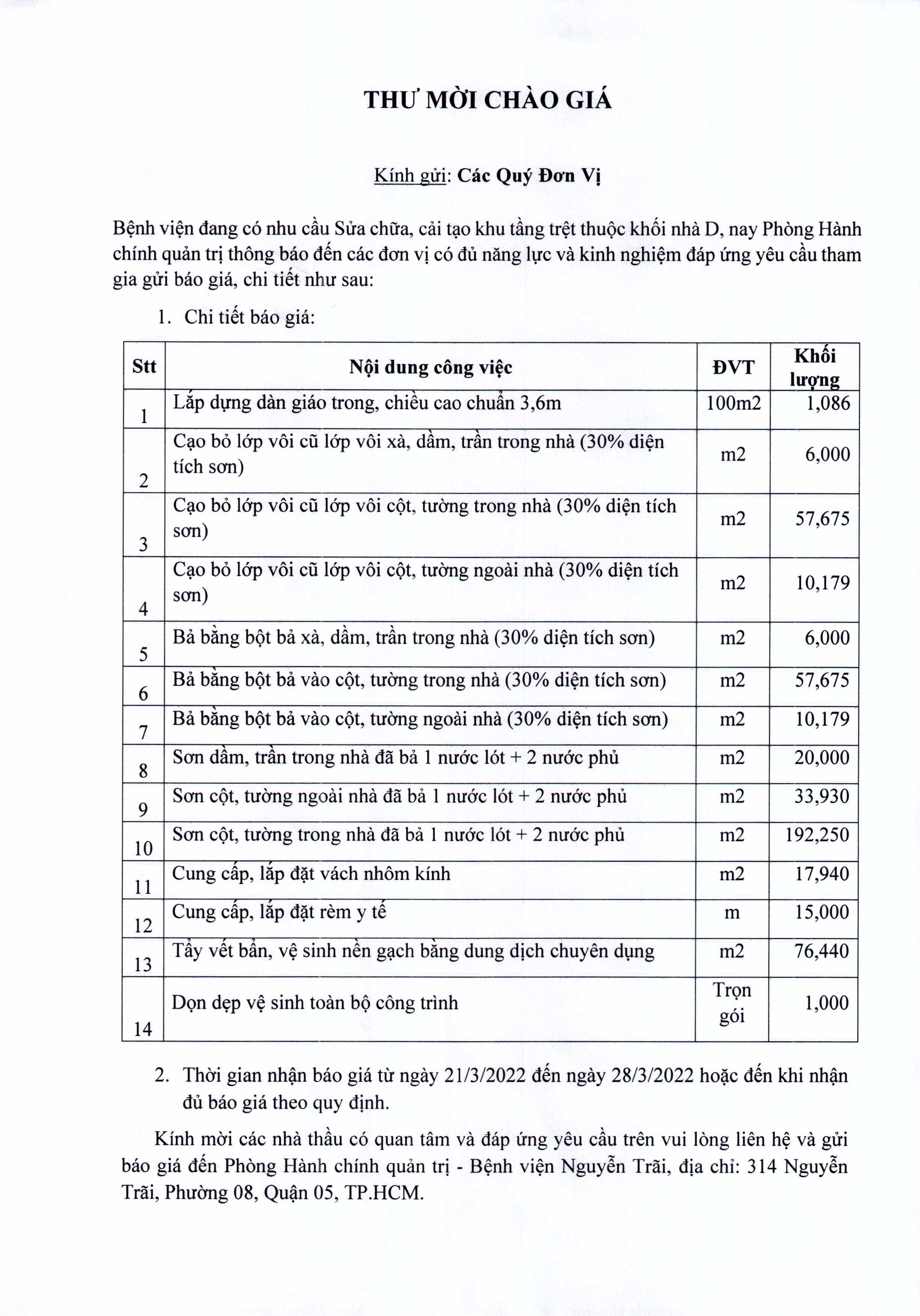 Thư mời chào giá Bệnh viện đang có nhu cầu sửa chữa, cải tạo khu tầng trệt thuộc khối nhà D