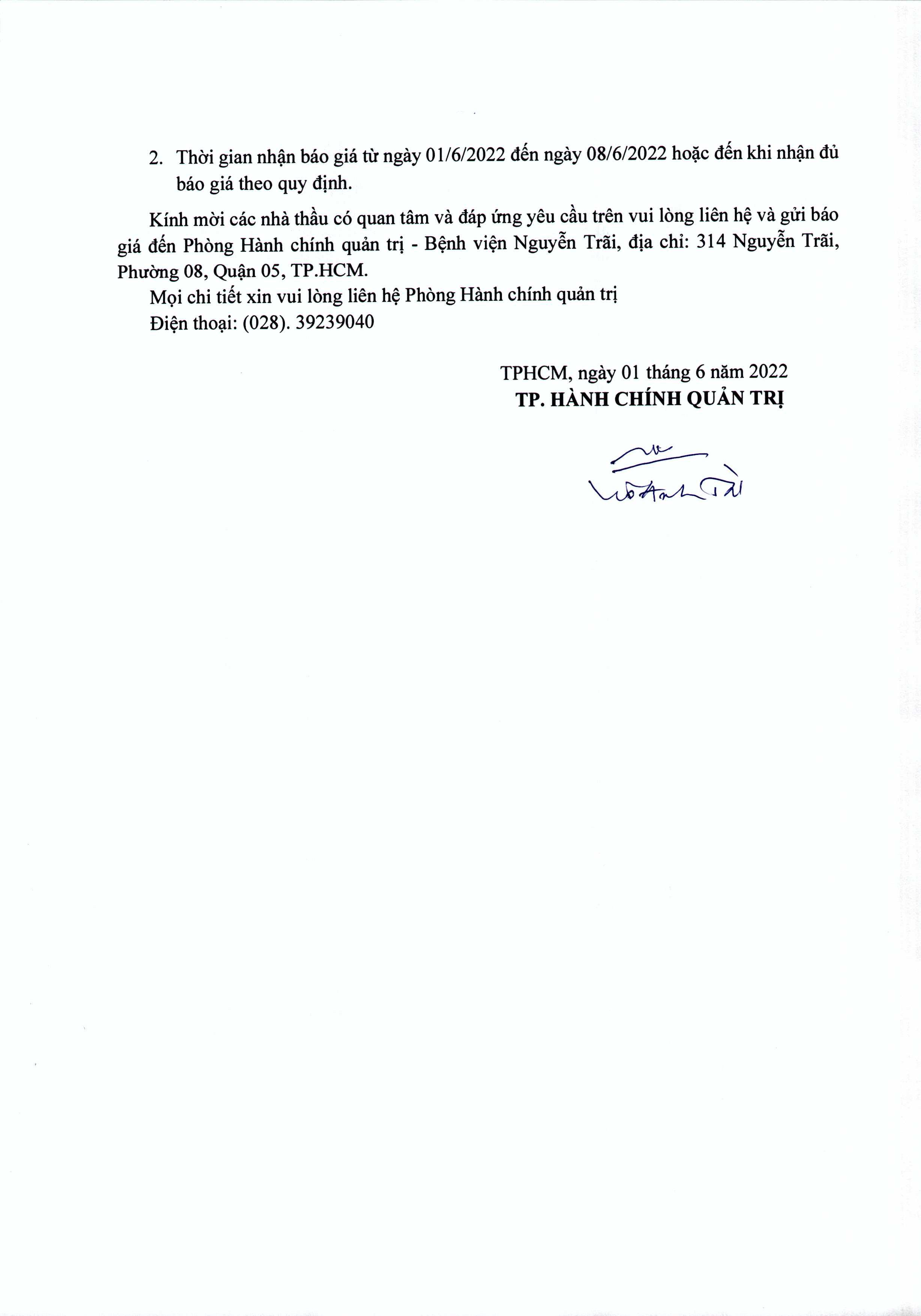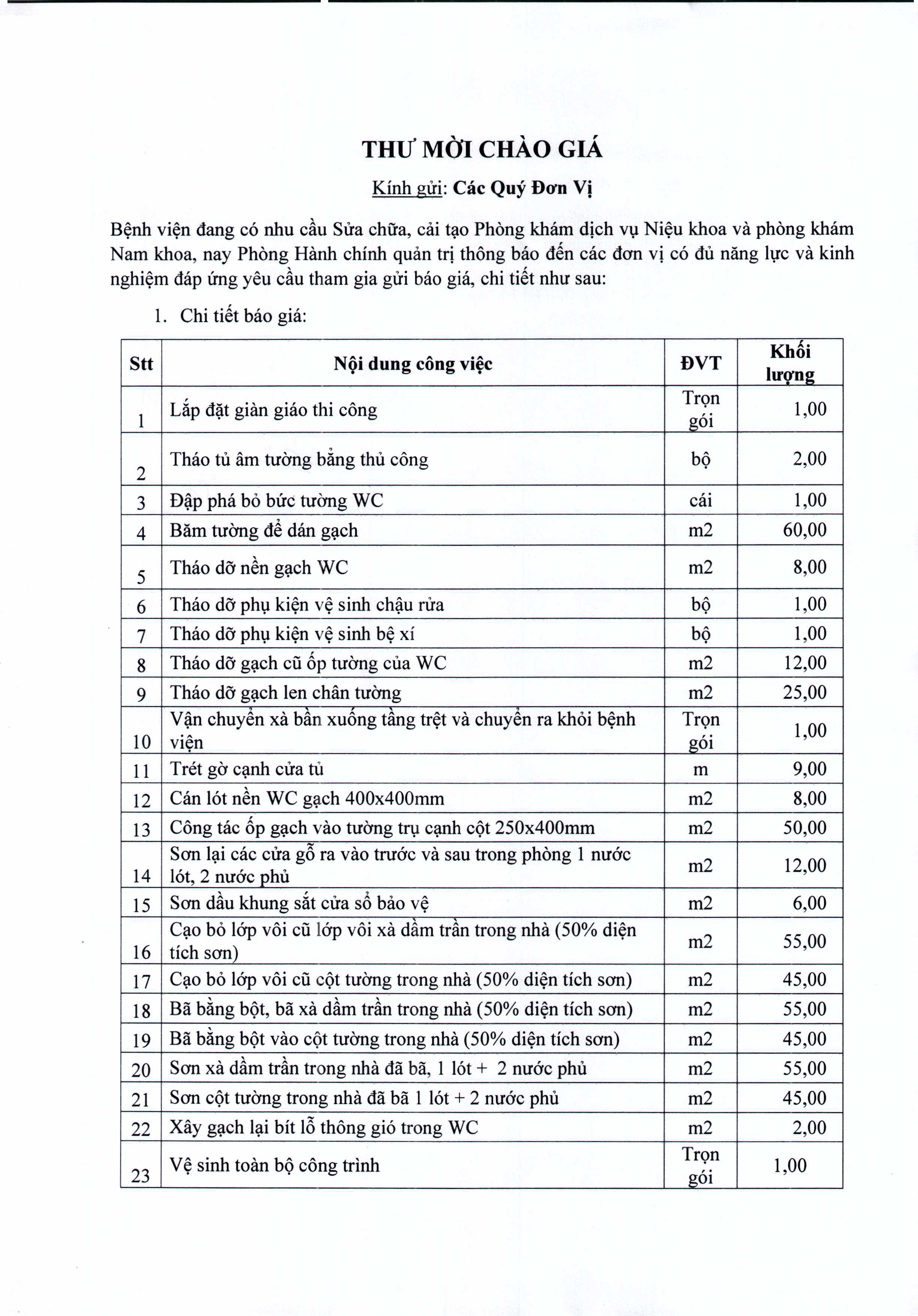 Thư mời chào giá Bệnh viện đang có nhu cầu sửa chữa, cải tạo Phòng khám dịch vụ Niệu khoa và phòng khám Nam khoa