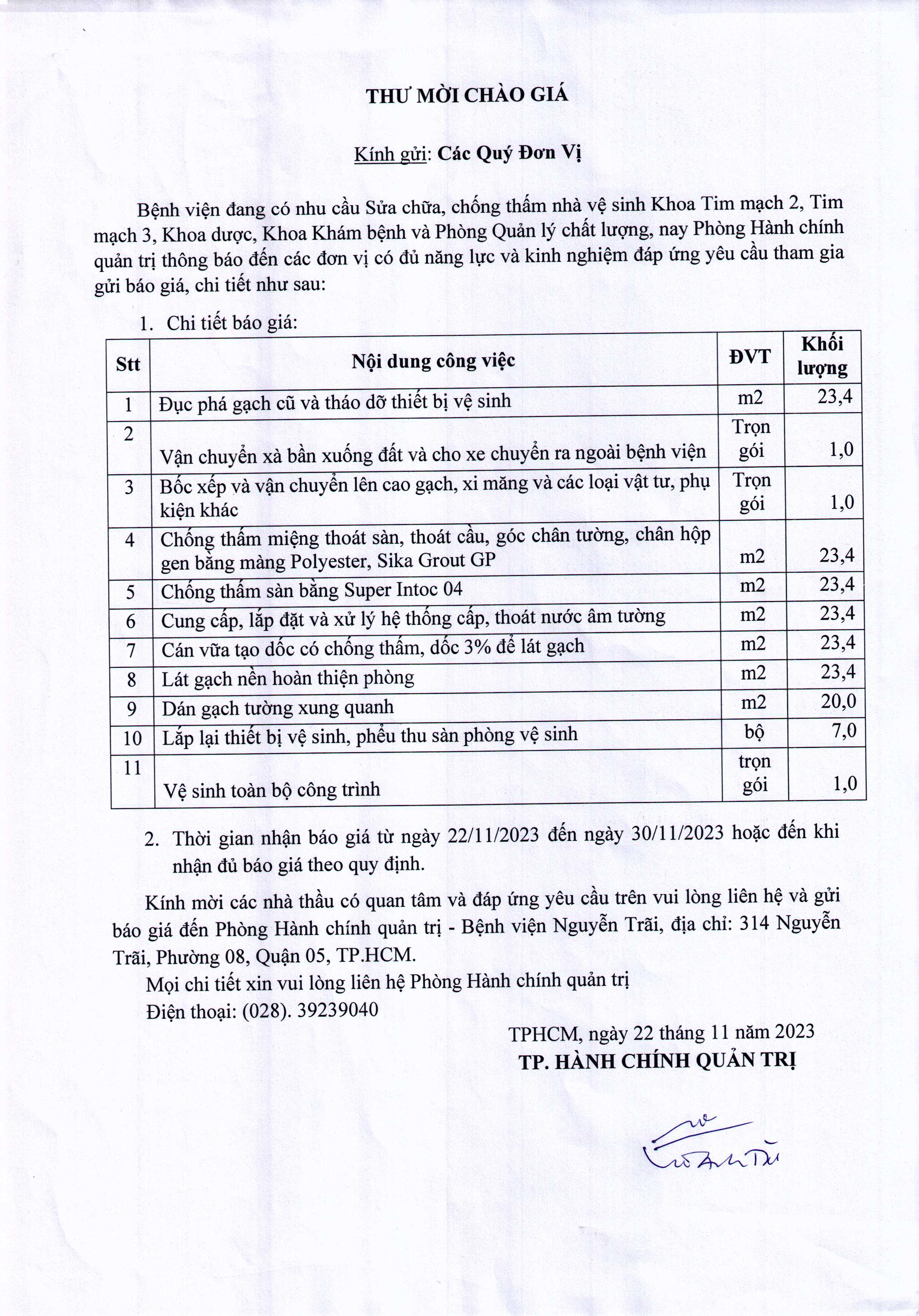 Thư mời chào giá Bệnh viện đang có nhu cầu sửa chữa, chống thấm nhà vệ sinh khoa Tim mạch 2, Tim mạch 3, Khoa Dược, Khoa Khám bệnh và Phòng Quản lý chất lượng
