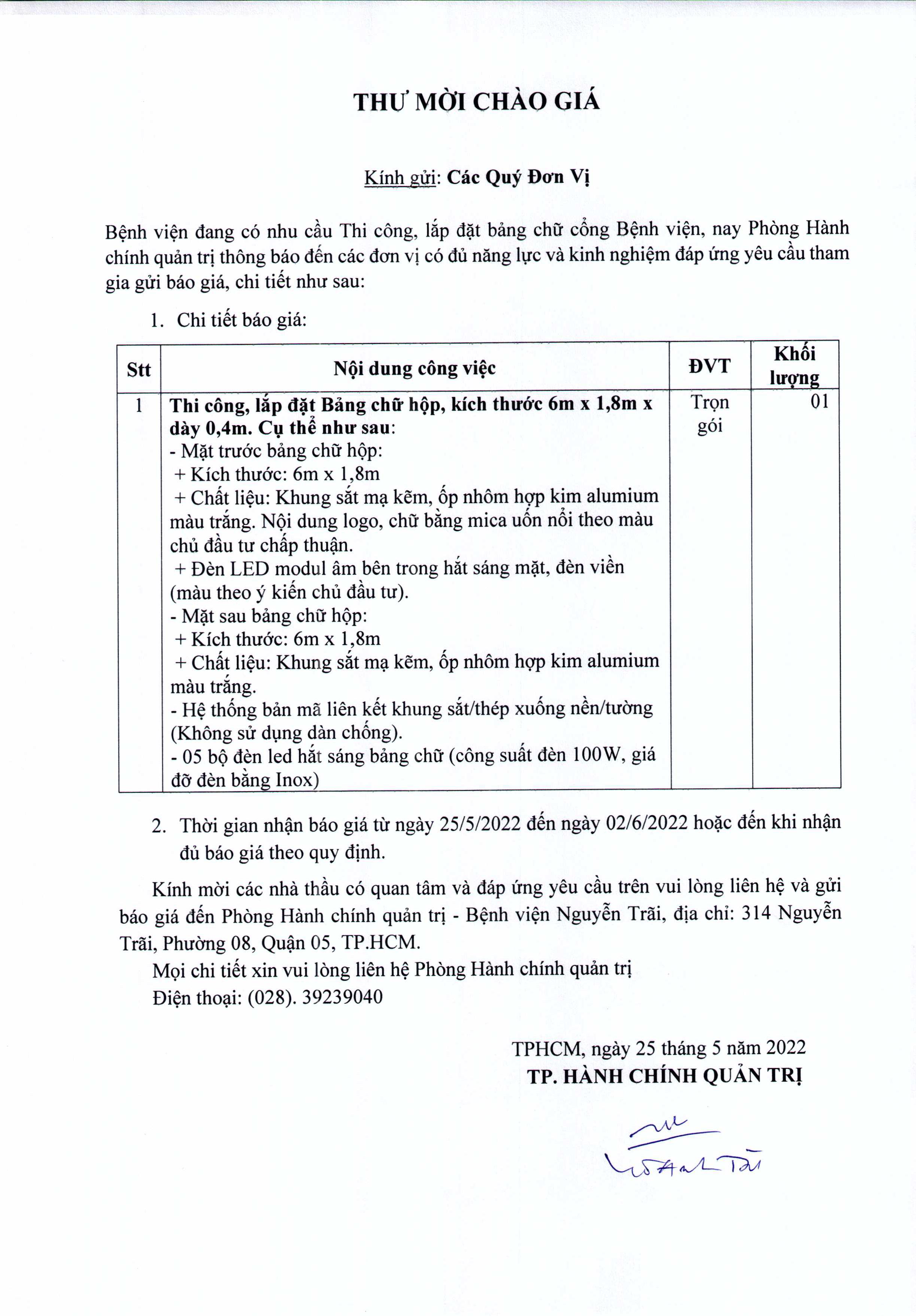 Thư mời chào giá Bệnh viện đang có nhu cầu thi công, lắp đặt bảng chữ cổng Bệnh viện