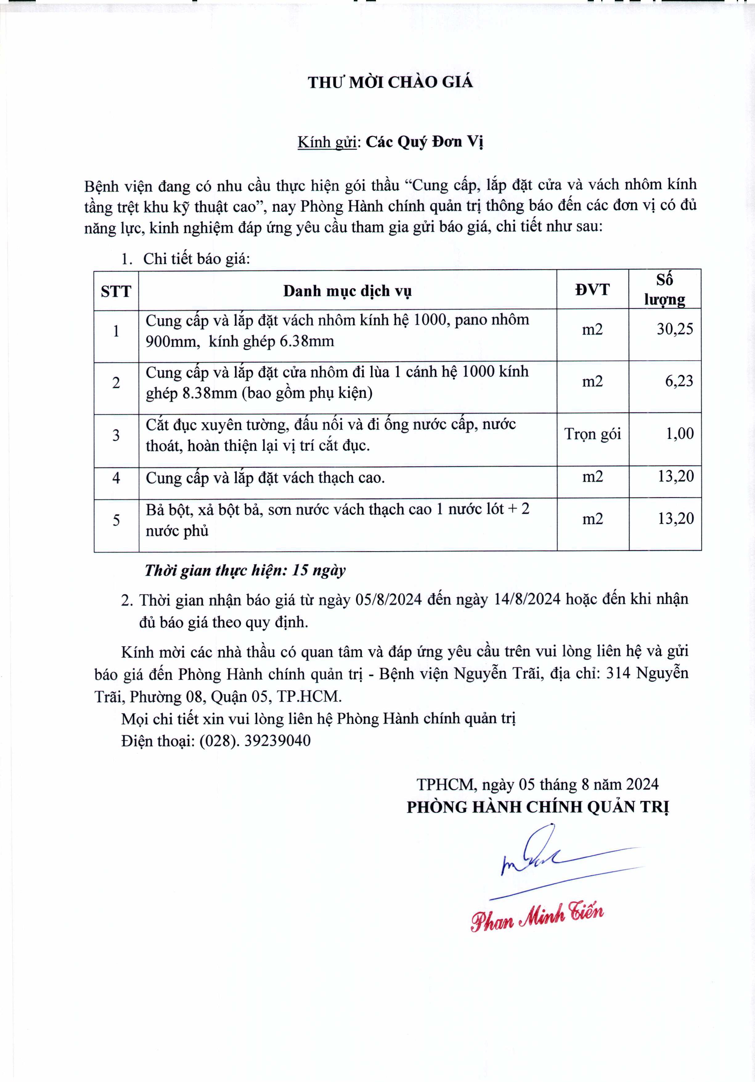 Thư mời chào giá Bệnh viện đang có nhu cầu thực hiện gói thầu “Cung cấp, lắp đặt cửa và vách nhôm kính tầng trệt khu kỹ thuật cao”