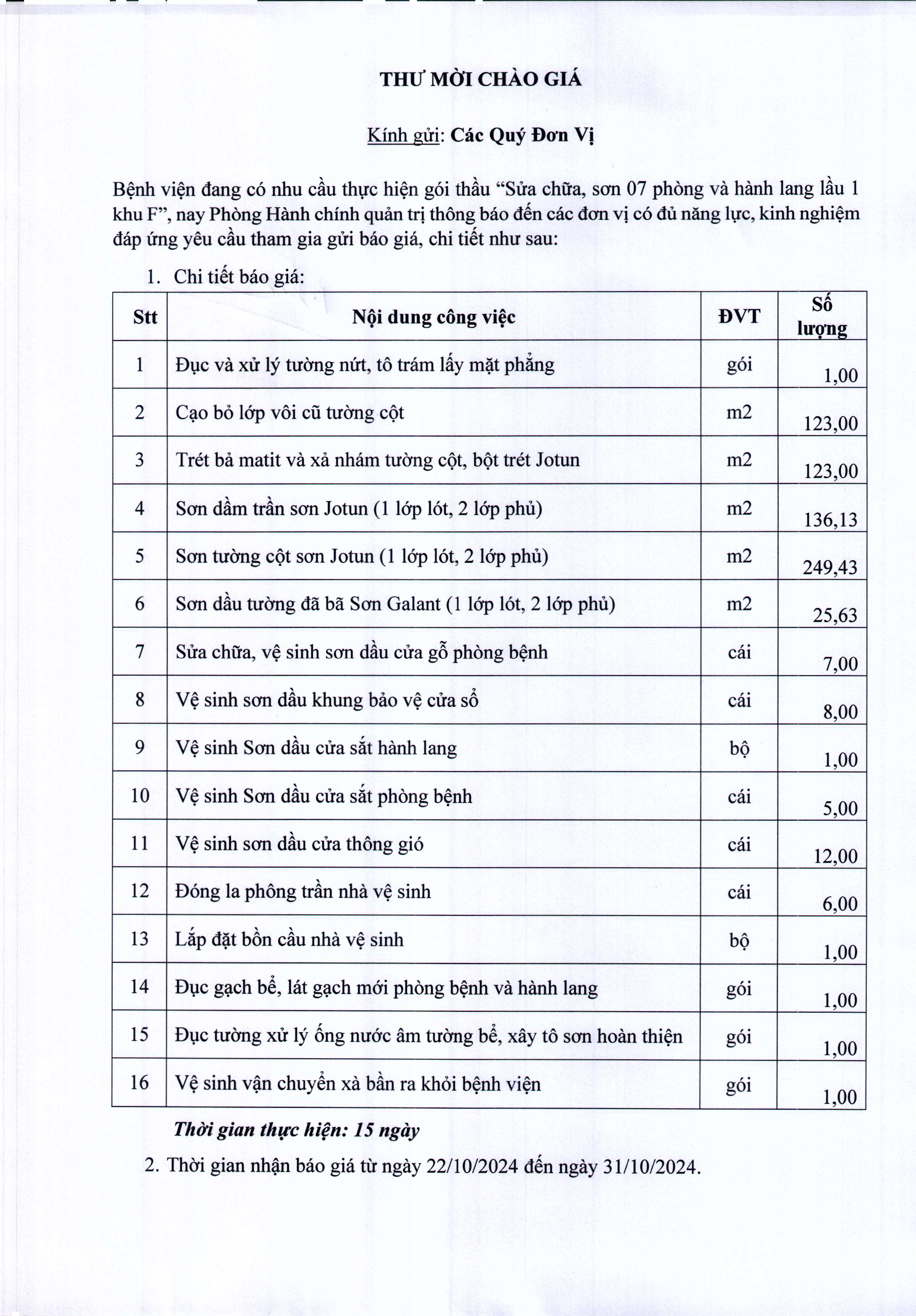 Thư mời chào giá Bệnh viện đang có nhu cầu thực hiện gói thầu ” Sửa chữa ,sơn 7 phòng và hành lang lầu 1 khu F “