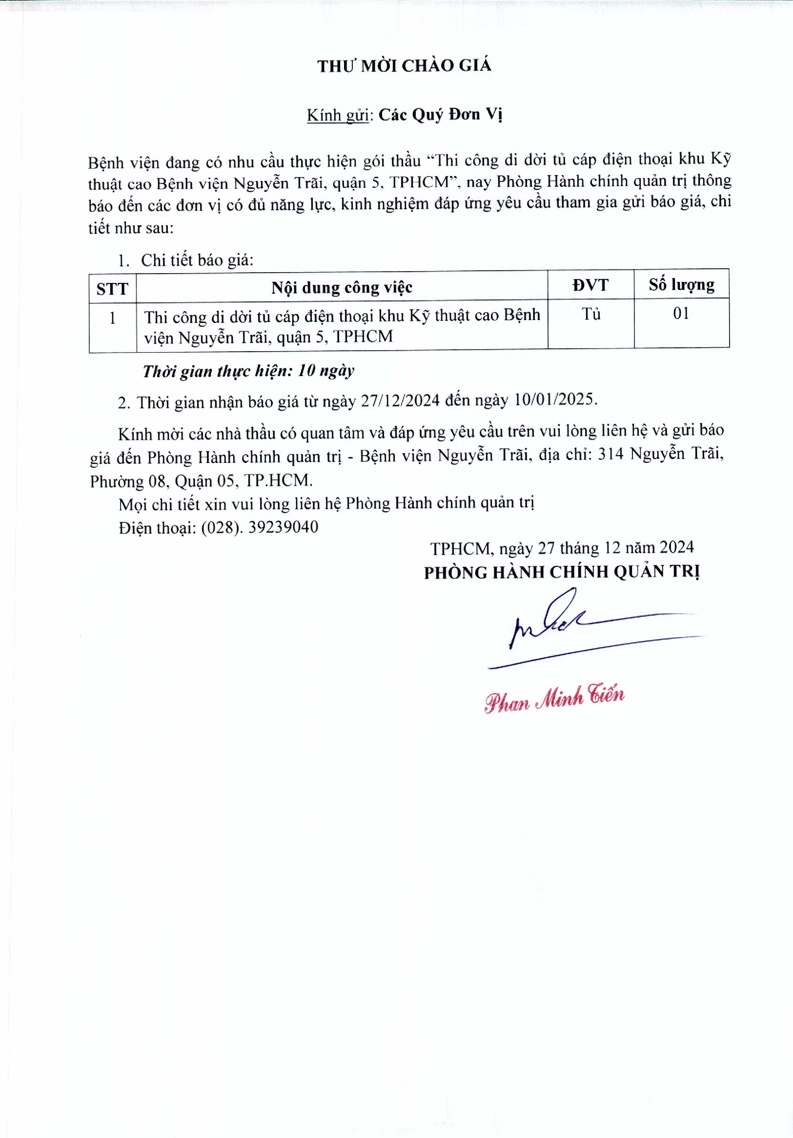 Thư mời chào giá Bệnh viện đang có nhu cầu thực hiện gói thầu ” Thi công di dời tủ cáp điện thoại khu Kỹ thuật cao Bệnh viện Nguyễn Trãi, quận 5, TPHCM”