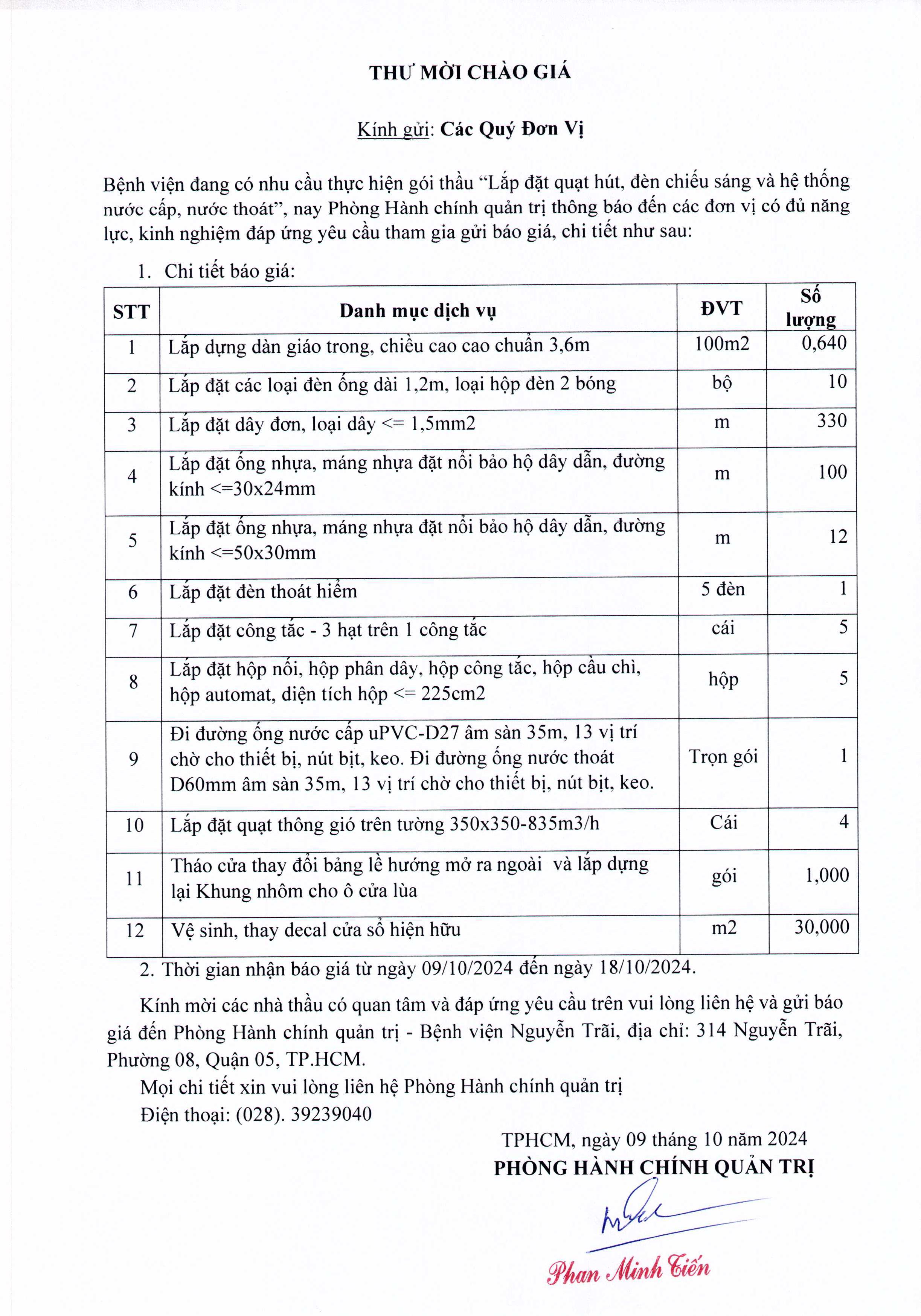 Thư mời chào giá bệnh viện đang có nhu cầu thực hiện gói thầu:”Lắp đặt quạt hút, đèn chiếu sáng và hệ thống nước cấp, nước thoát “