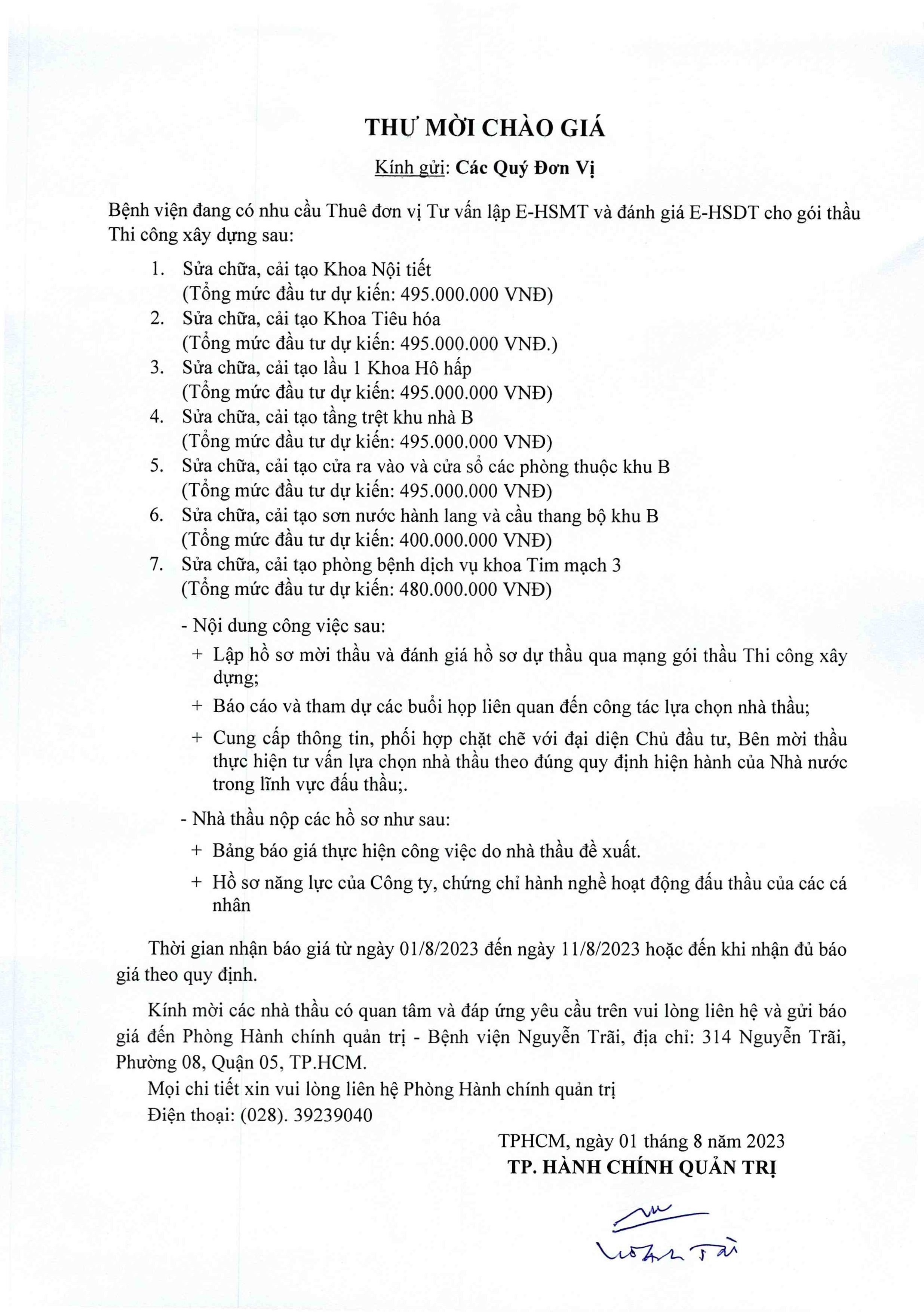 Thư mời chào giá Bệnh viện đang có nhu cầu thuê đơn vị tư vấn lập E-HSMT và đánh giá E-HSDT cho gói thầu thi công xây dựng