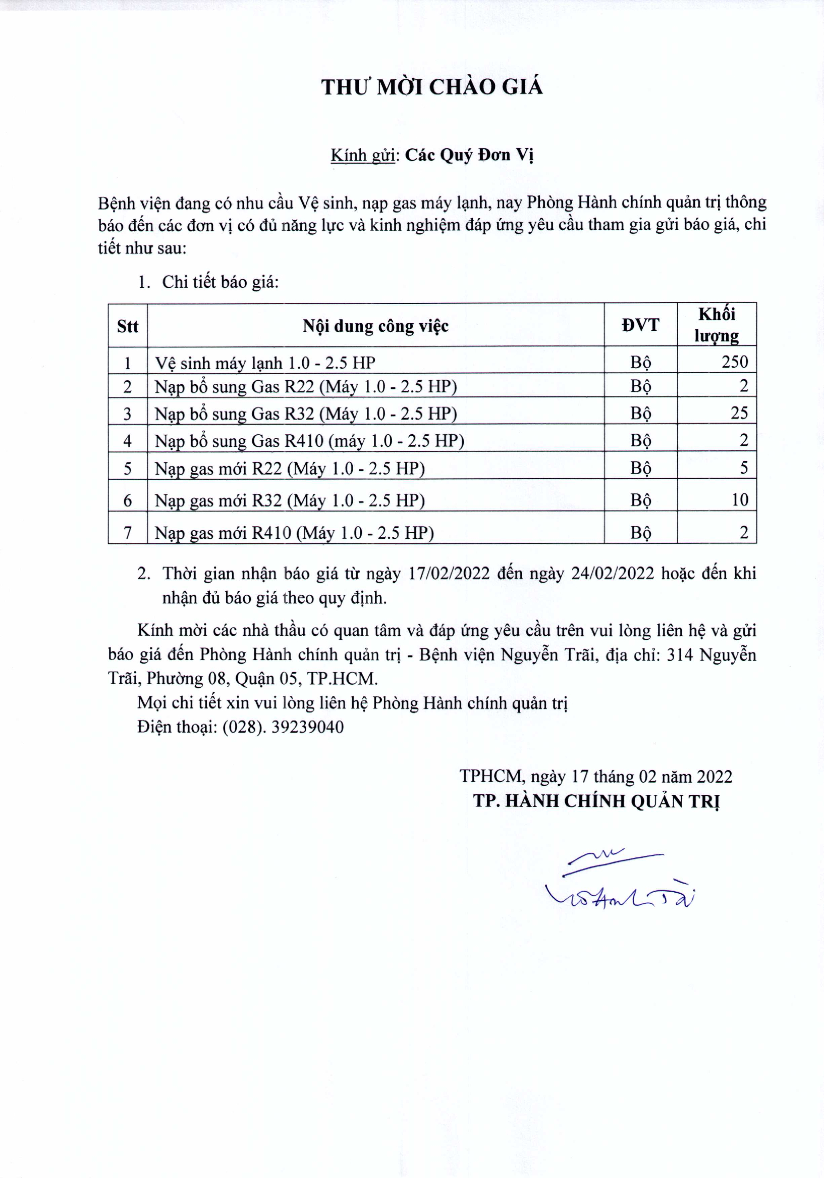 Thư mời chào giá Bệnh viện đang có nhu cầu vệ sinh, nạp gas máy lạnh