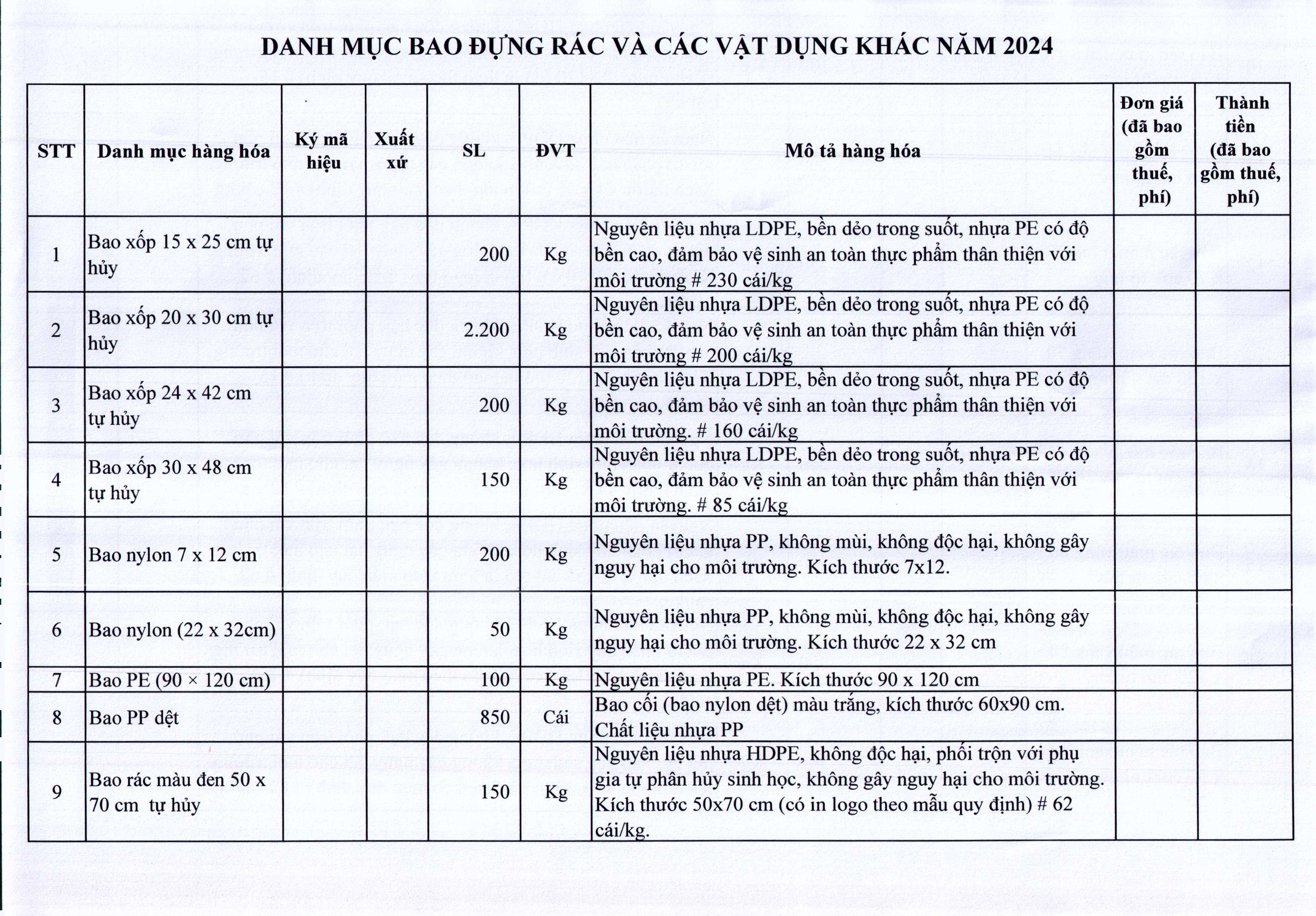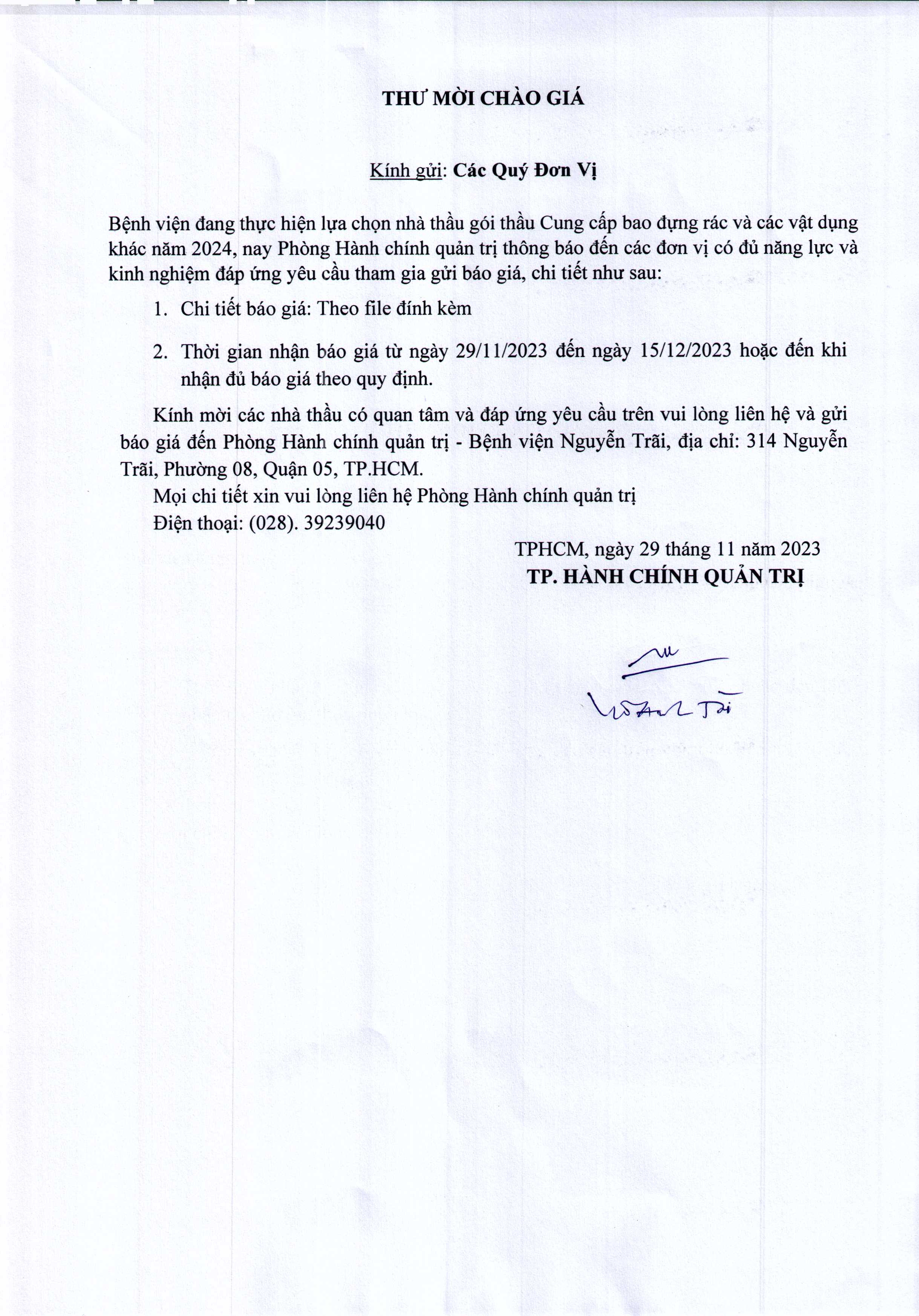 Thư mời chào giá Bệnh viện đang thực hiện lựa chọn nhà thầu gói thầu cung cấp bao đựng rác và các vật dụng khác năm 2024