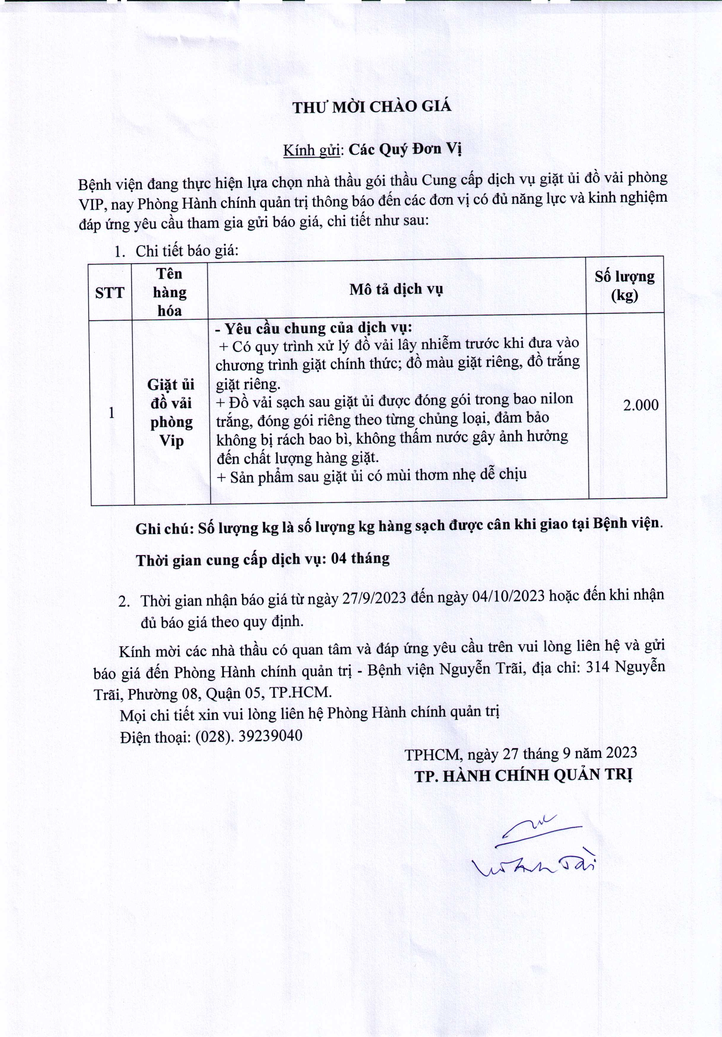 Thư mời chào giá Bệnh viện đang thực hiện lựa chọn nhà thầu gói thầu cung cấp dịch vụ giặt ủi đồ vải phòng VIP