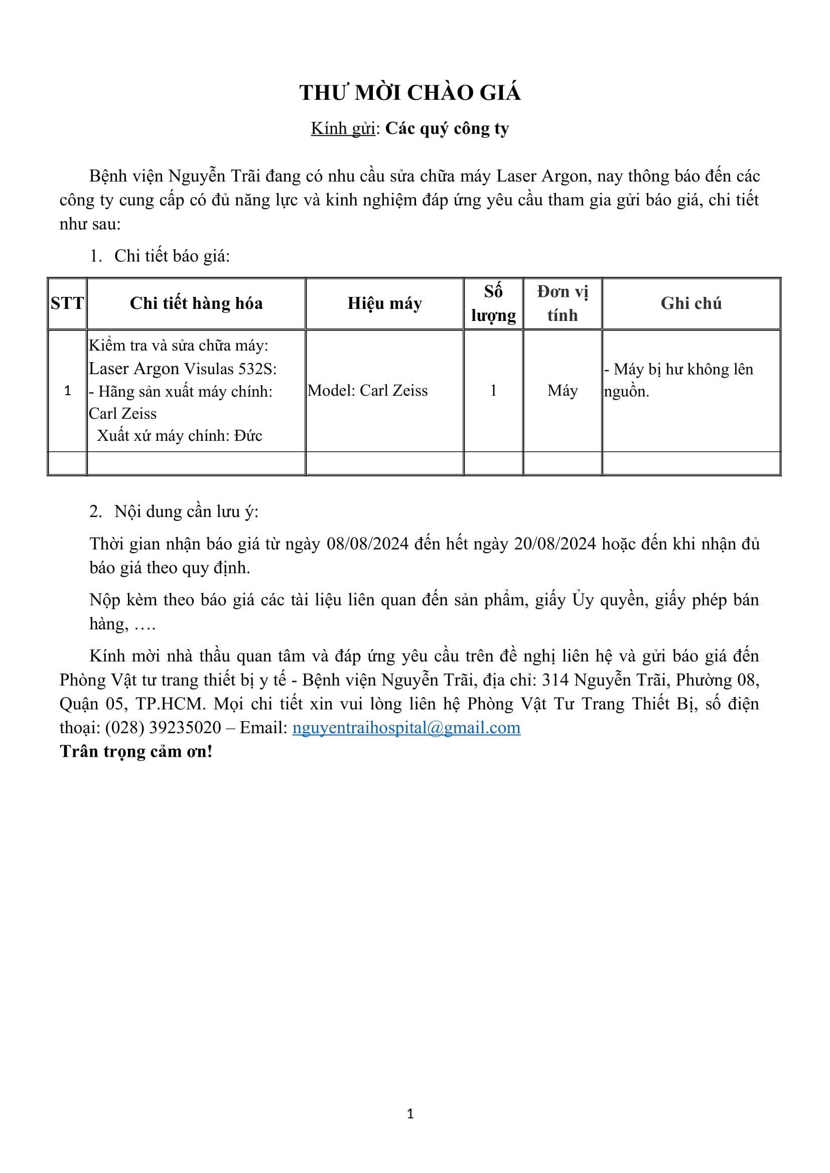 Thư mời chào giá Bệnh viện Nguyễn Trãi có nhu cầu sửa chữa máy Laser Argon