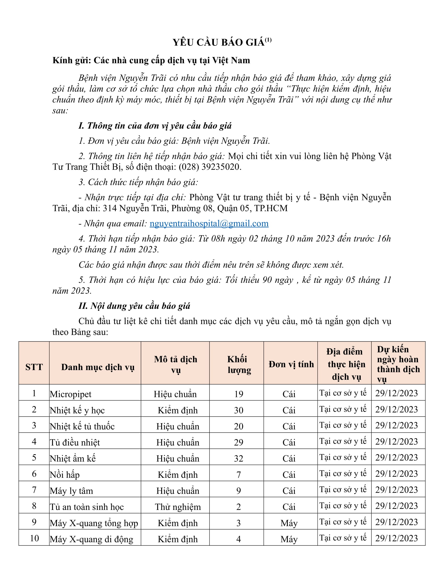 Thư mời chào giá Bệnh viện Nguyễn Trãi có nhu cầu tiếp nhận báo giá để tham khảo, xây dựng giá gói thầu, làm cơ sở tổ chức lựa chọn nhà thầu cho gói thầu