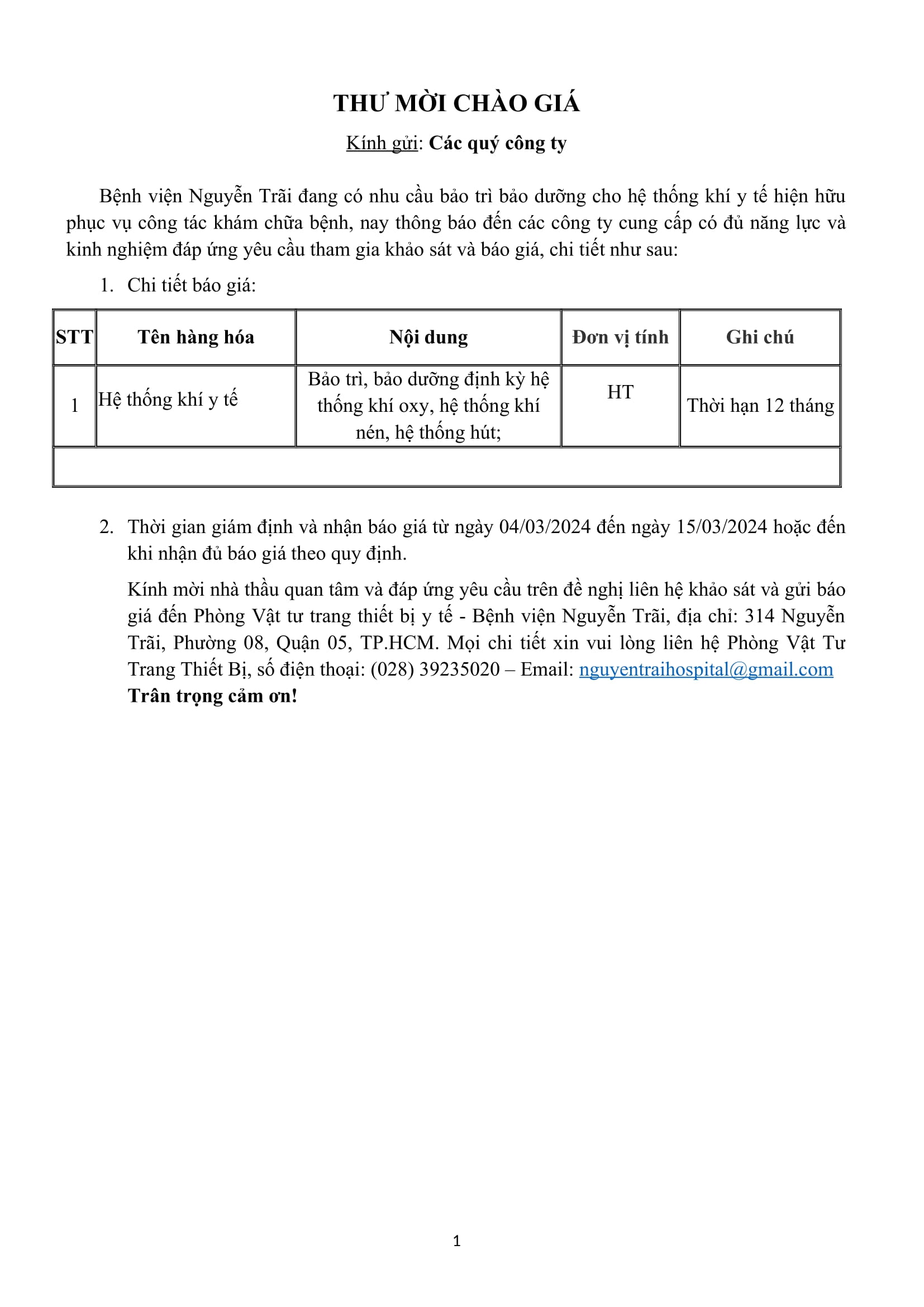 Thư mời chào giá Bệnh viện Nguyễn Trãi đang có nhu cầu bảo trì bảo dưỡng cho hệ thống khí y tế hiện hữu phục vụ cho công tác khám chữa bệnh