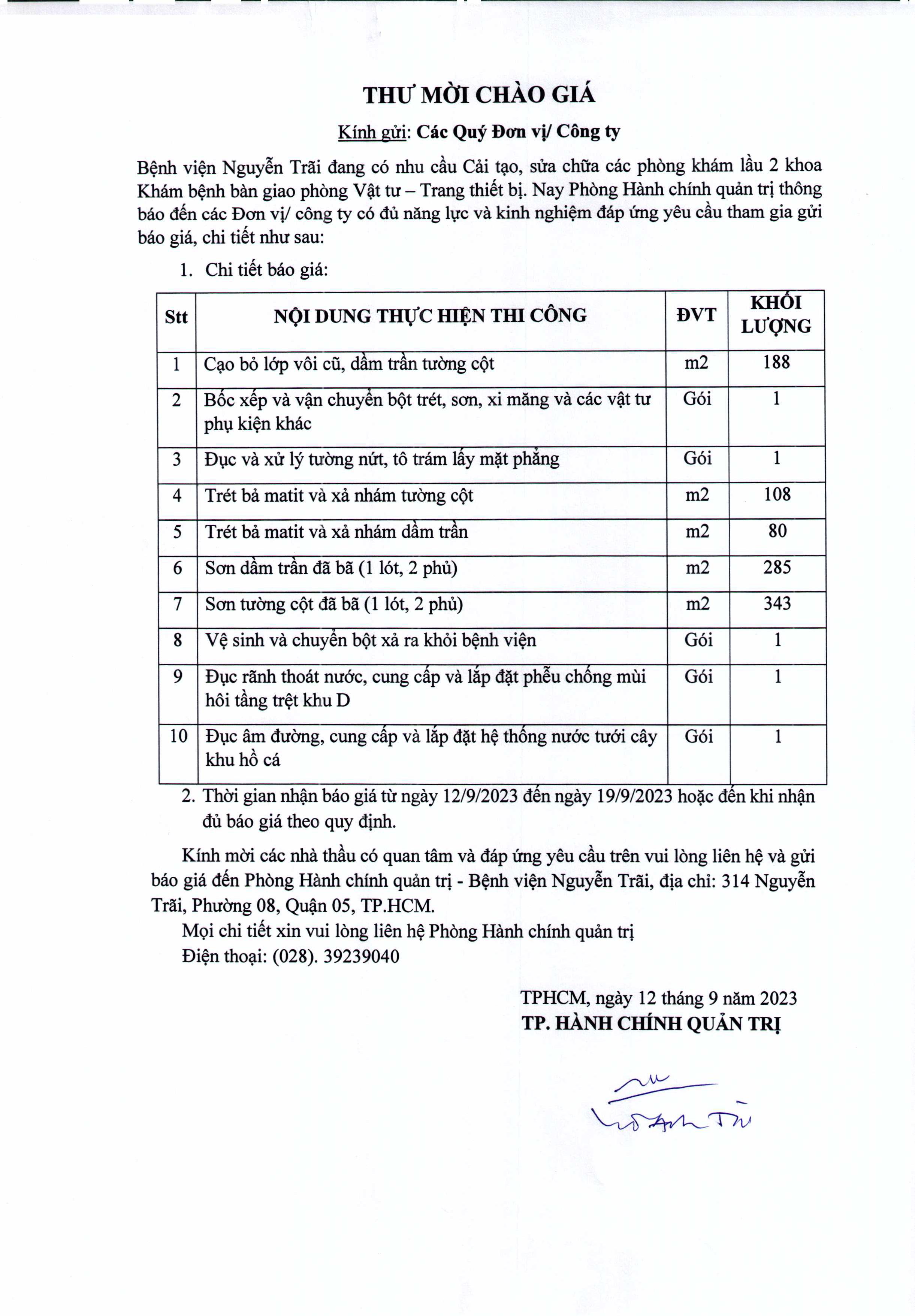 Thư mời chào giá Bệnh viện Nguyễn Trãi đang có nhu cầu cải tạo, sửa chữa các phòng khám lầu 2 khoa Khám bệnh bàn giao cho phòng Vật tư-Trang thiết bị