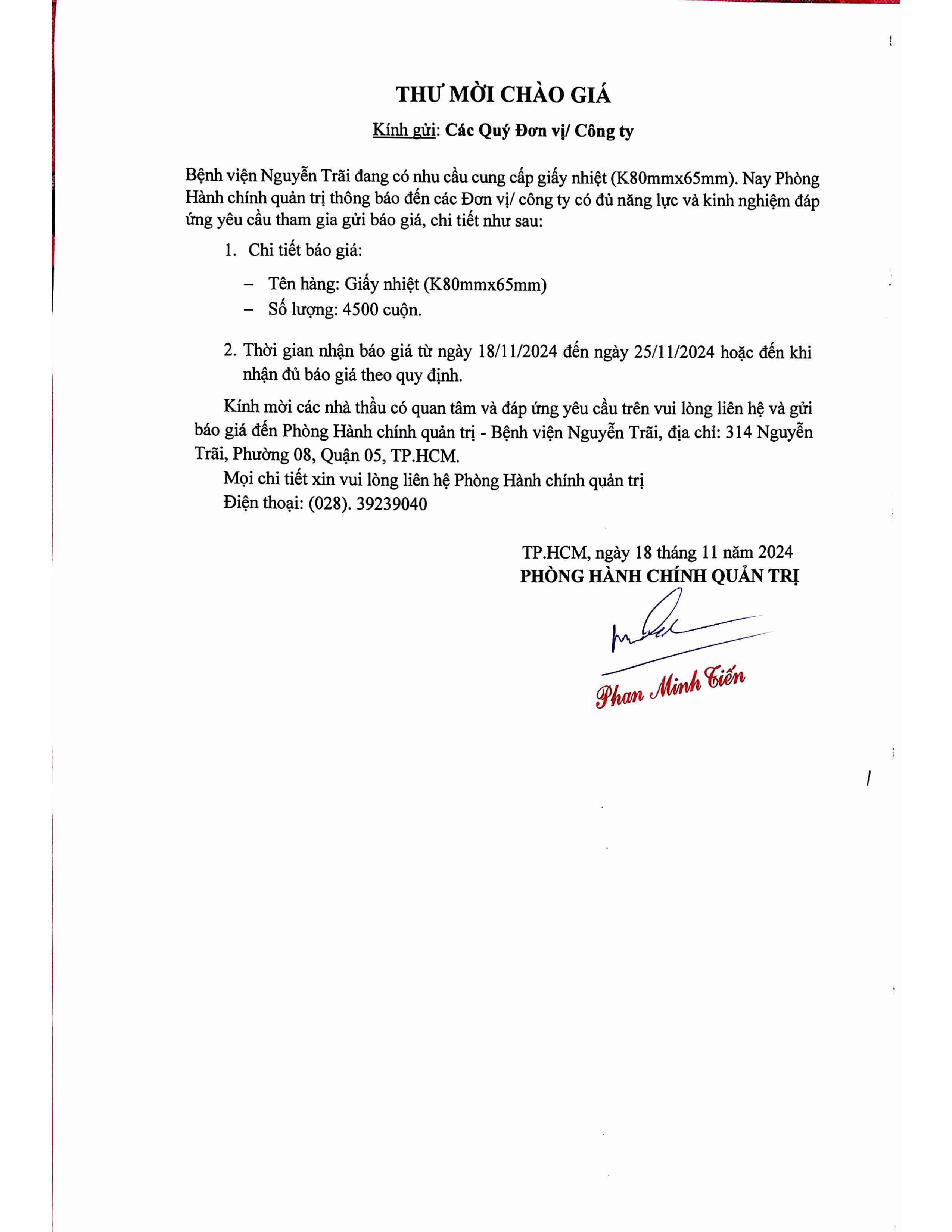 Thư mời chào giá bệnh viện Nguyễn Trãi đang có nhu cầu cung cấp giấy nhiệt (K80mm x 65mm)