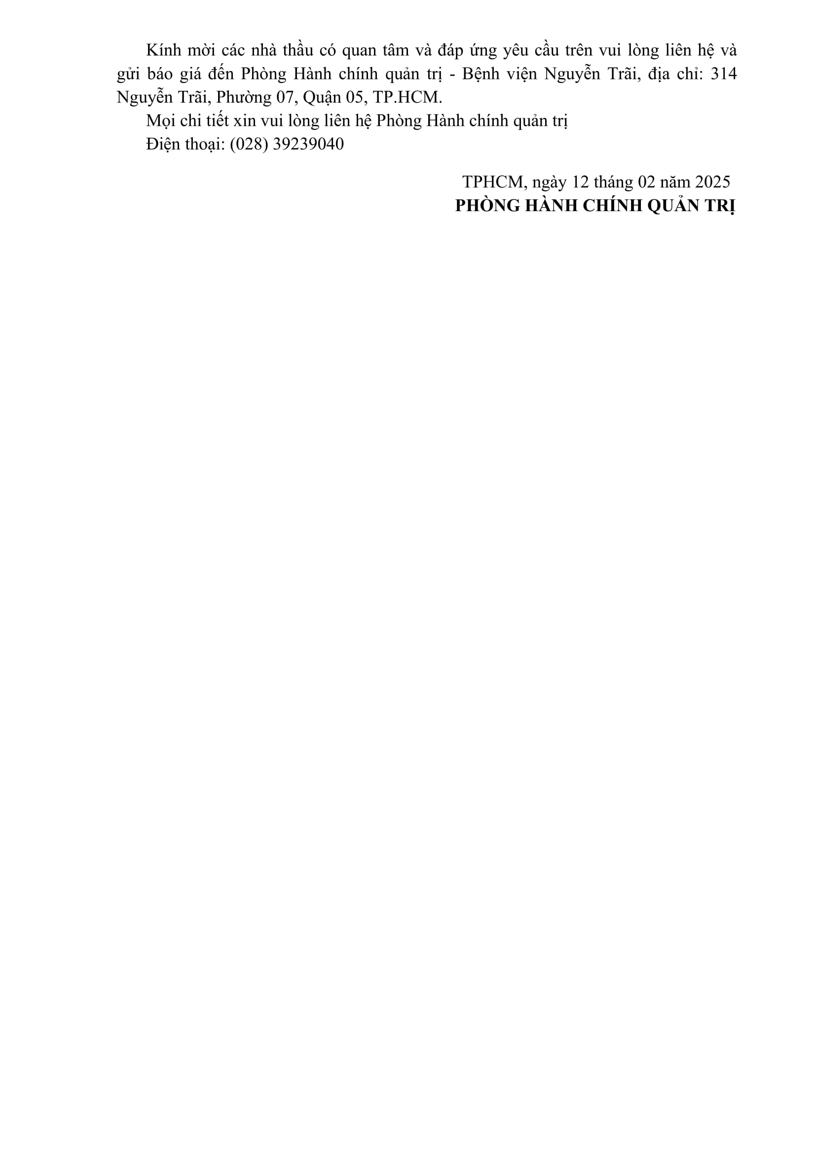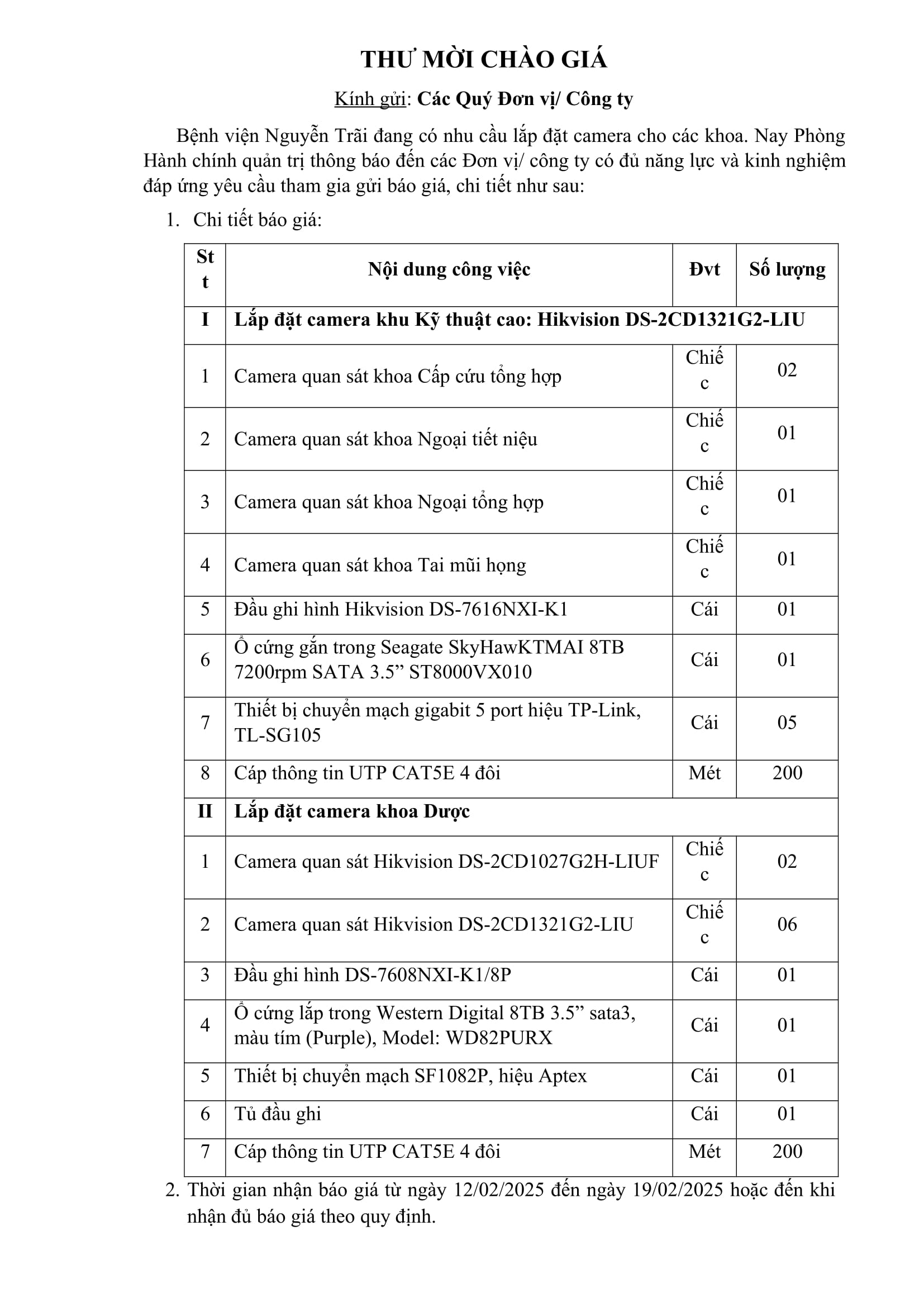 Thư mời chào giá Bệnh viện Nguyễn Trãi đang có nhu cầu lắp đặt camera cho các khoa