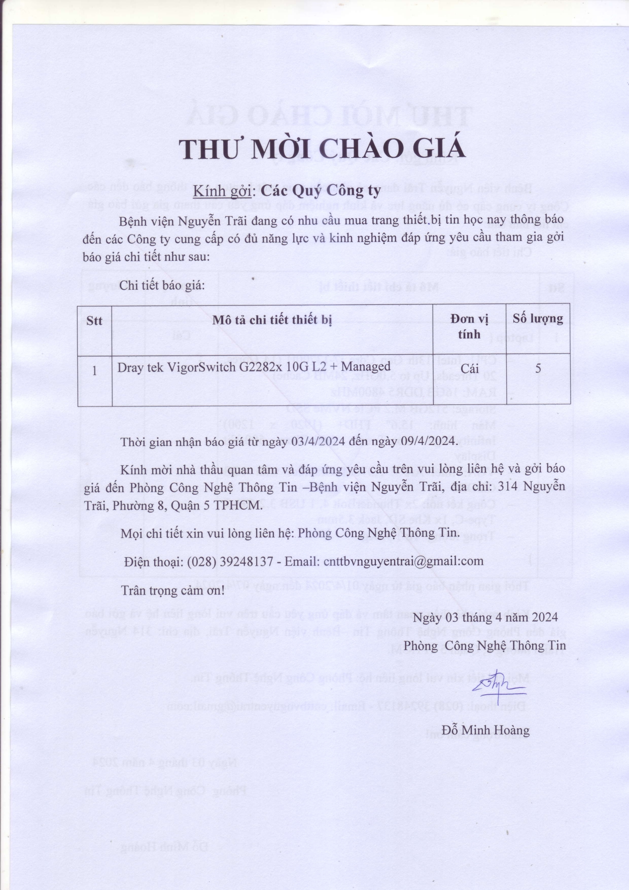 Thư mời chào giá Bệnh viện Nguyễn Trãi đang có nhu cầu mua trang thiết bị tin học