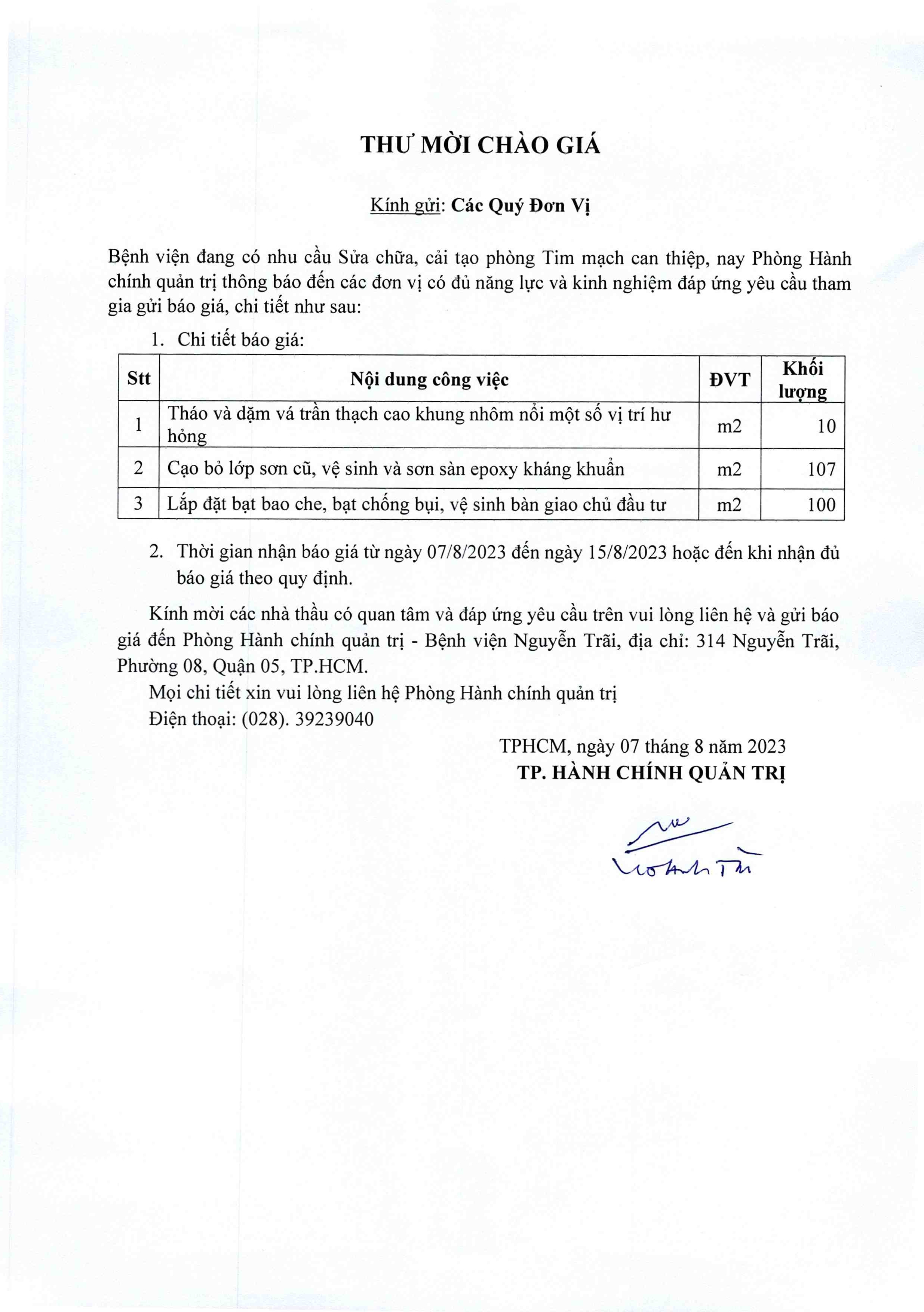 Thư mời chào giá Bệnh viện Nguyễn Trãi đang có nhu cầu sửa chữa, cải tạo phòng Tim mạch can thiệp