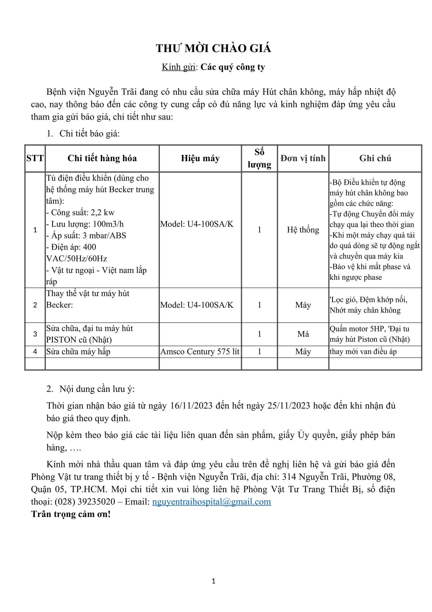 Thư mời chào giá Bệnh viện Nguyễn Trãi đang có nhu cầu sửa chữa máy hút chân không, máy hấp nhiệt độ cao