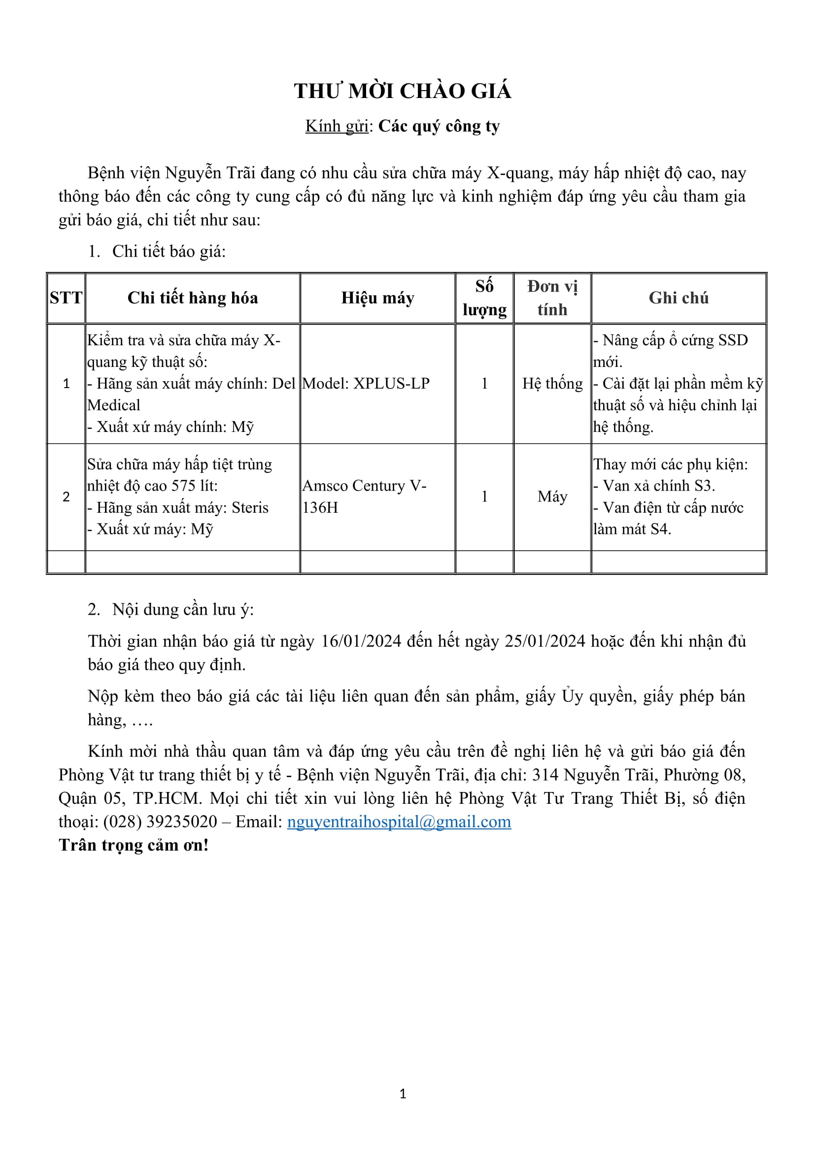 Thư mời chào giá Bệnh viện Nguyễn Trãi đang có nhu cầu sửa chữa máy X-quang, máy hấp nhiệt độ cao