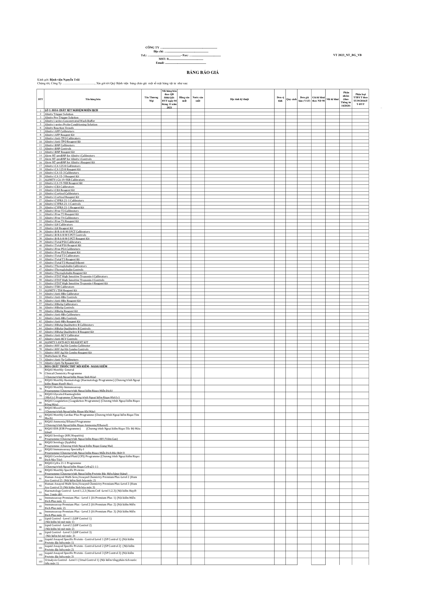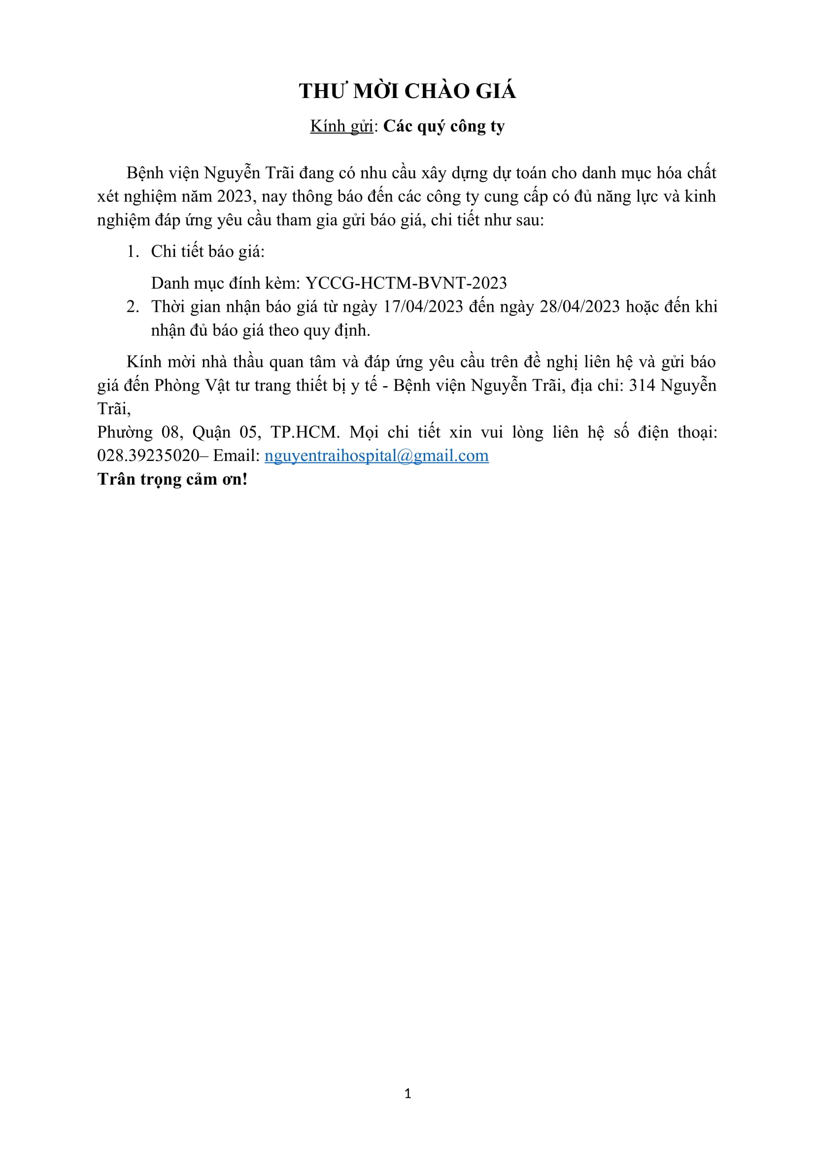 Thư mời chào giá Bệnh viện Nguyễn trãi đang có nhu cầu xây dựng dự toán cho danh mục hóa chất xét nghiệm năm 2023