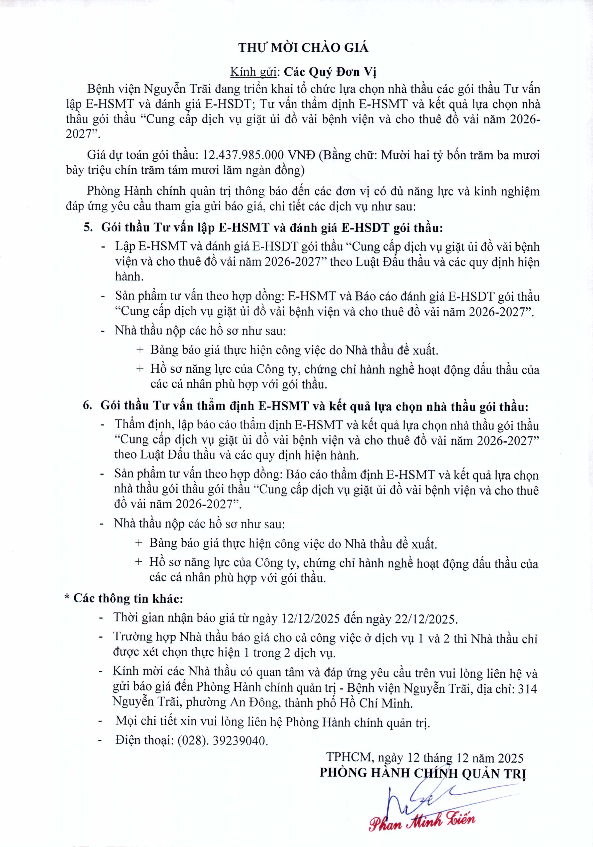 Invitation to Bid: Nguyen Trai Hospital is currently conducting a tender process for the following services: "Providing hospital linen laundry and linen rental services for 2026-2027," including consulting services for preparing E-bids and E-submission documents, consulting services for evaluating E-bids, and the selection of contractors.