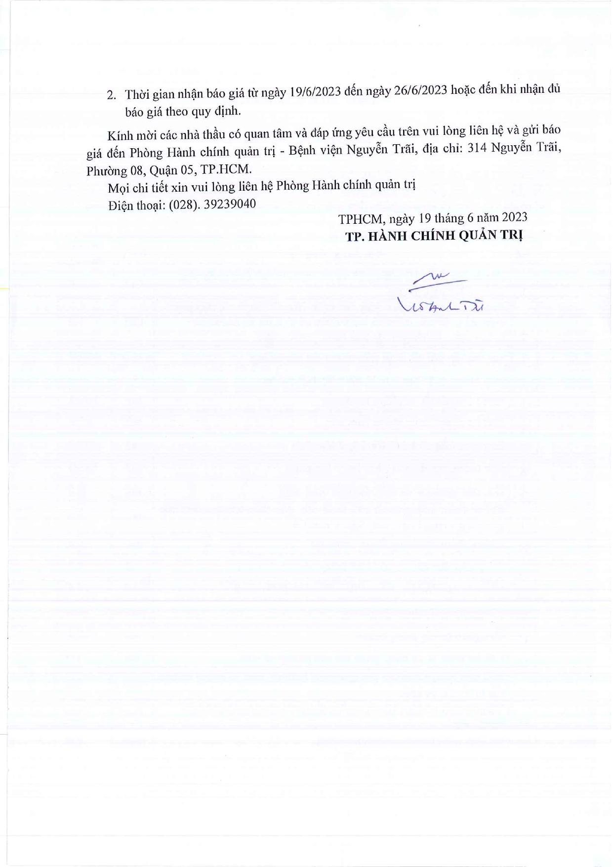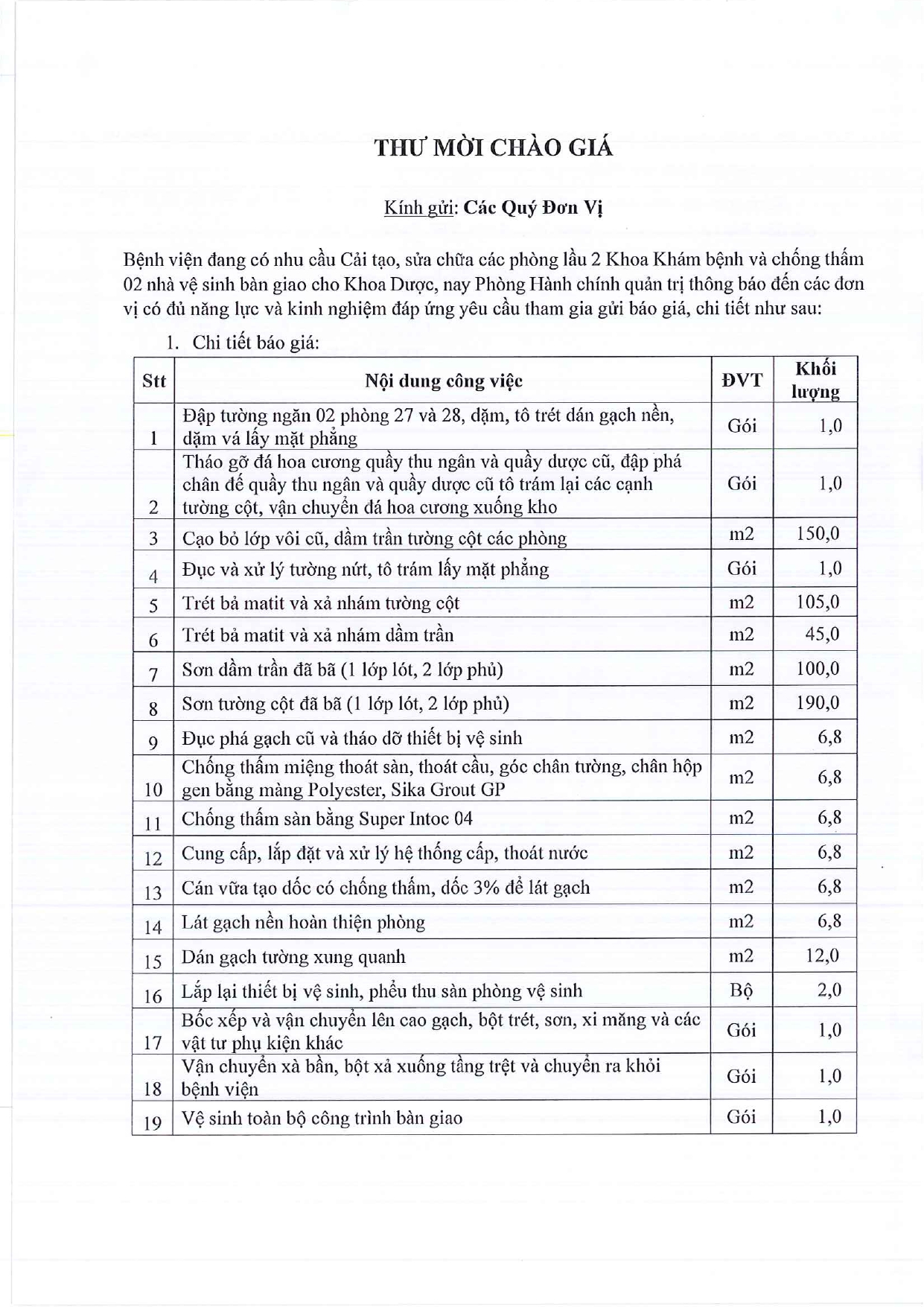 Thư mời chào giá cải tạo, sửa chữa các phòng lầu 2 Khoa Khám bệnh và chống thấm 02 nhà vệ sinh bàn giao cho khoa Dược
