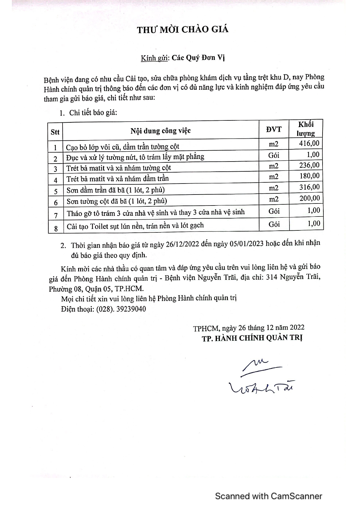 Thư mời chào giá cải tạo, sửa chữa phòng khám dịch vụ tầng trệt khu D
