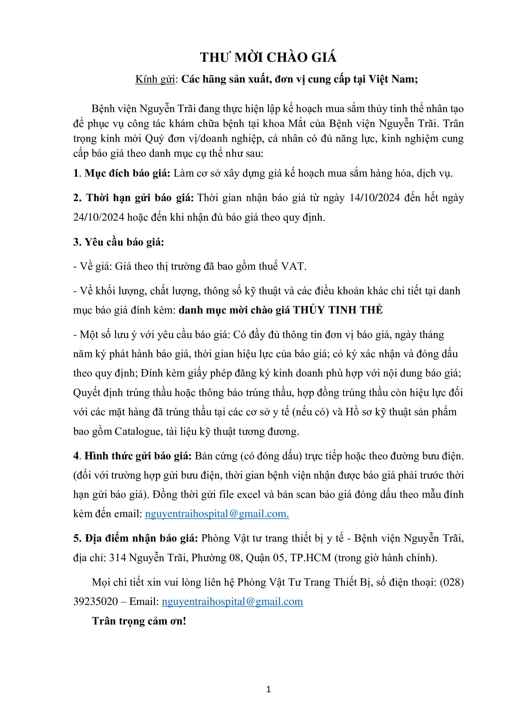 Thư mời chào giá cho kế hoạch mua sắm thủy tinh thể nhân tạo để phục vụ công tác khám chữa bệnh tại khoa Mắt của Bệnh viện Nguyễn Trãi