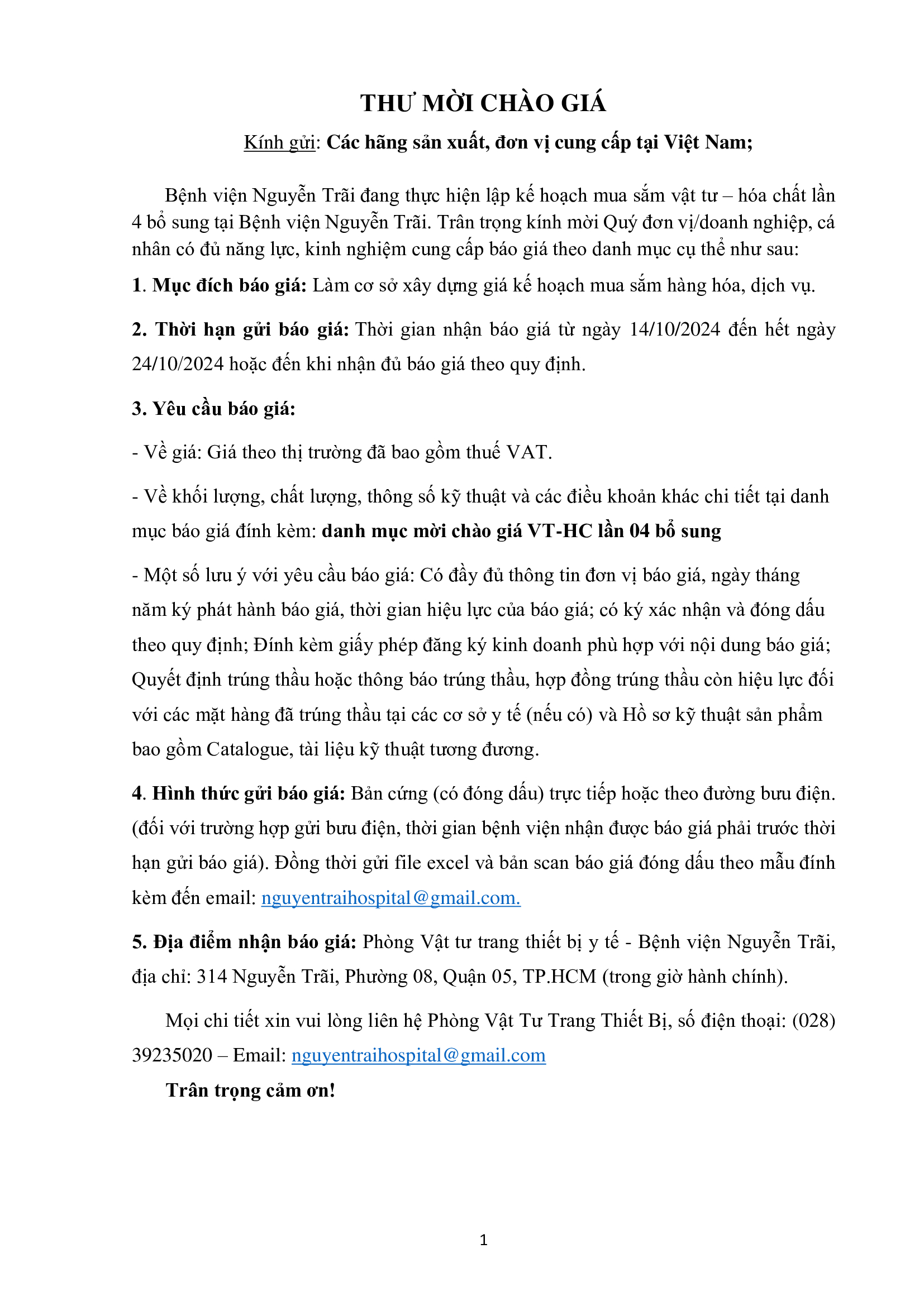 Thư mời chào giá cho kế hoạch mua sắm vật tư – hóa chất lần 4 bổ sung tại Bệnh viện Nguyễn Trãi
