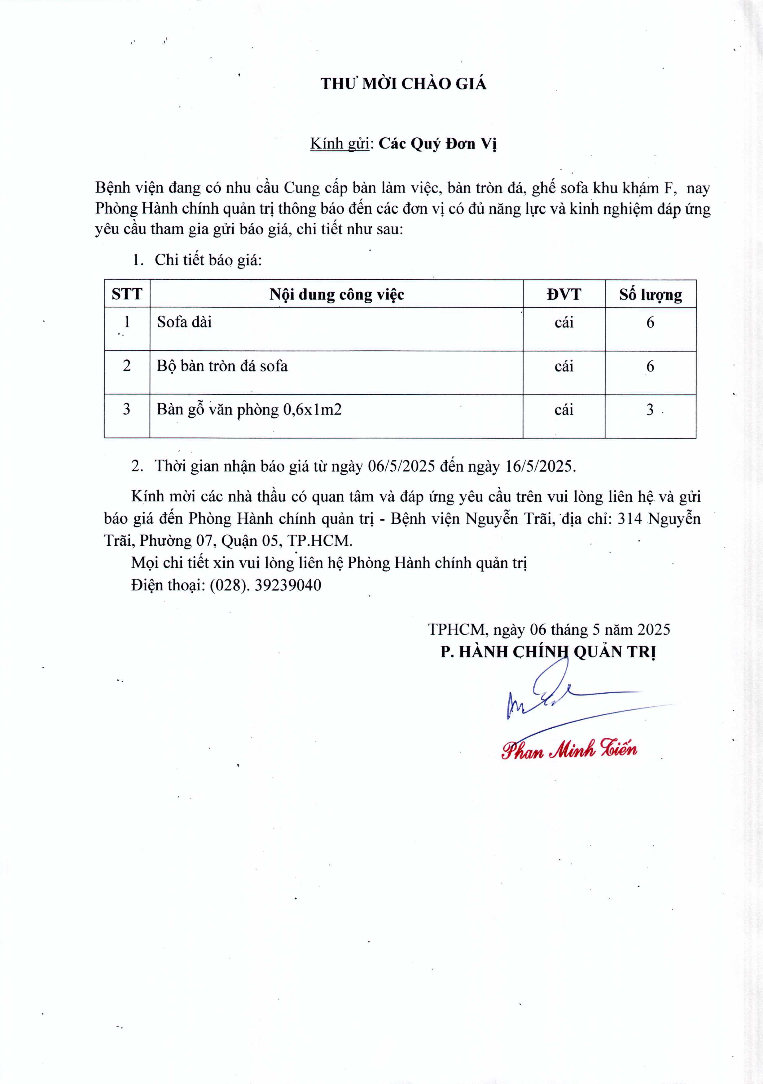 Invitation to submit bids for the supply of work desks, round stone tables, and sofas for examination area F.