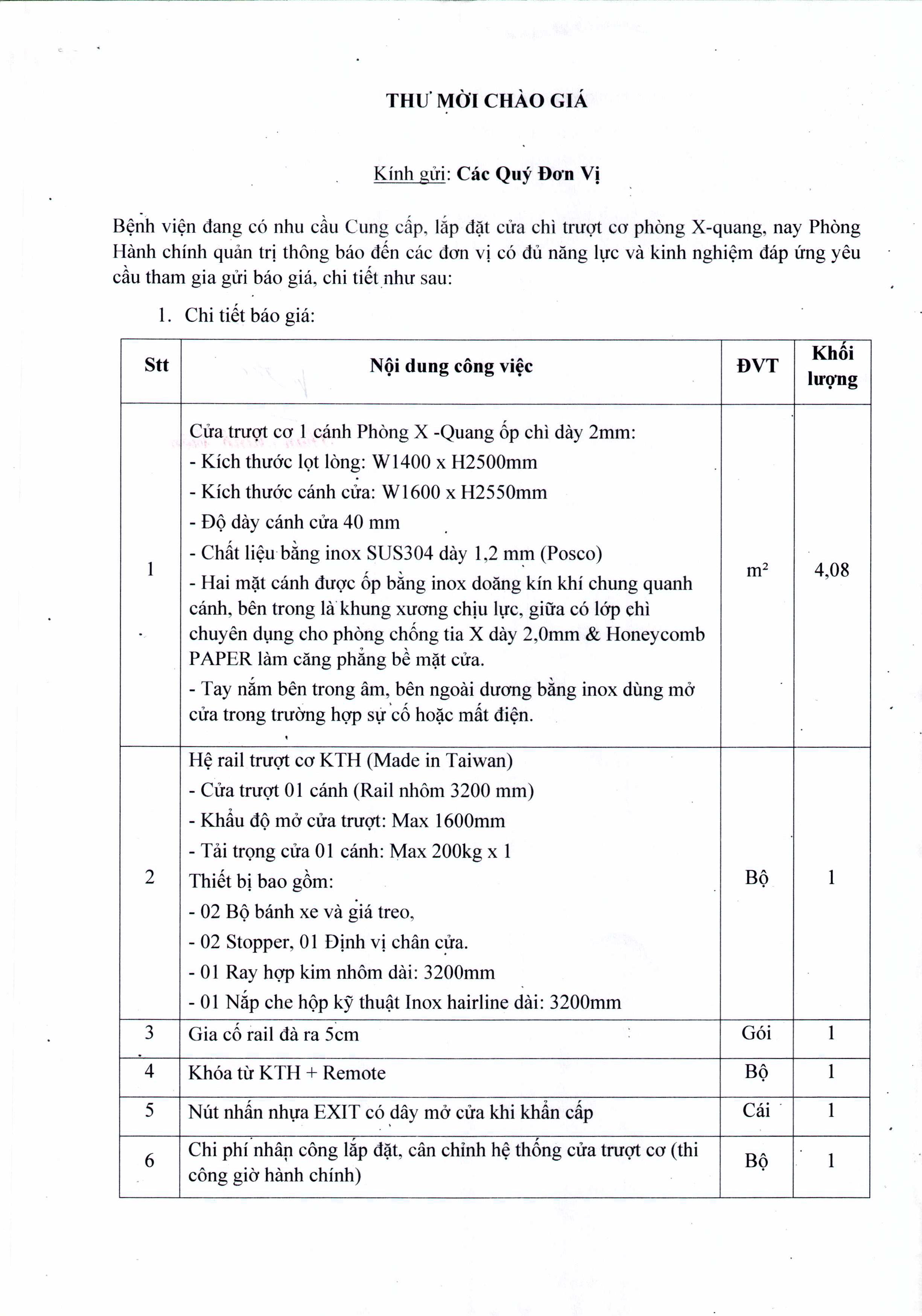 Thư mời chào giá Cung cấp lắp đặt cửa chì trượt cơ phòng Xquang