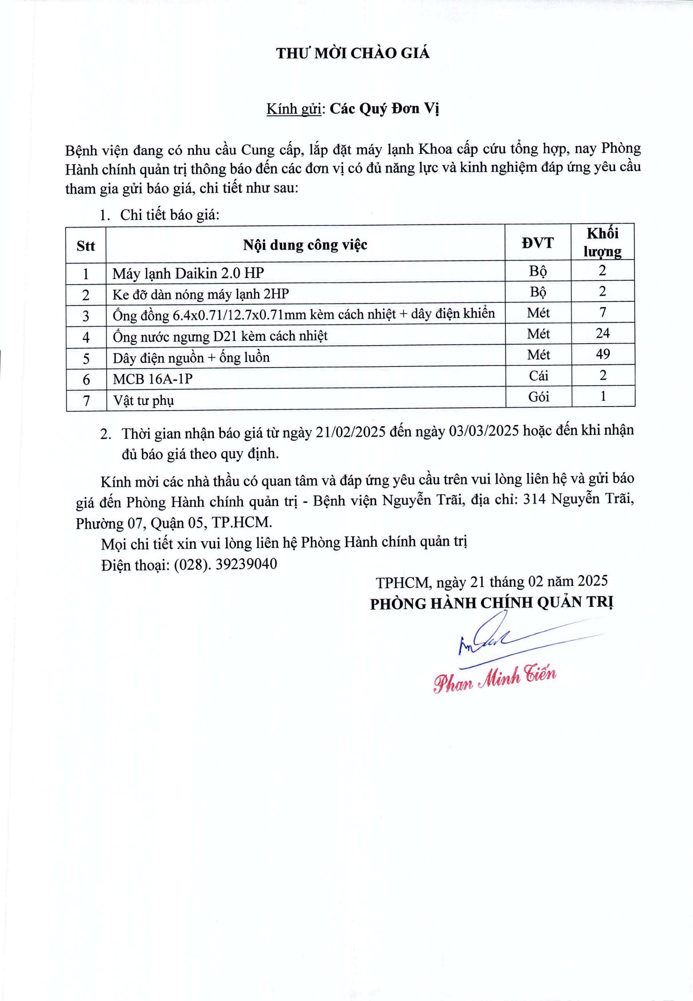 Thư mời chào giá Cung cấp, lắp đặt máy lạnh khoa Cấp cứu tổng hợp