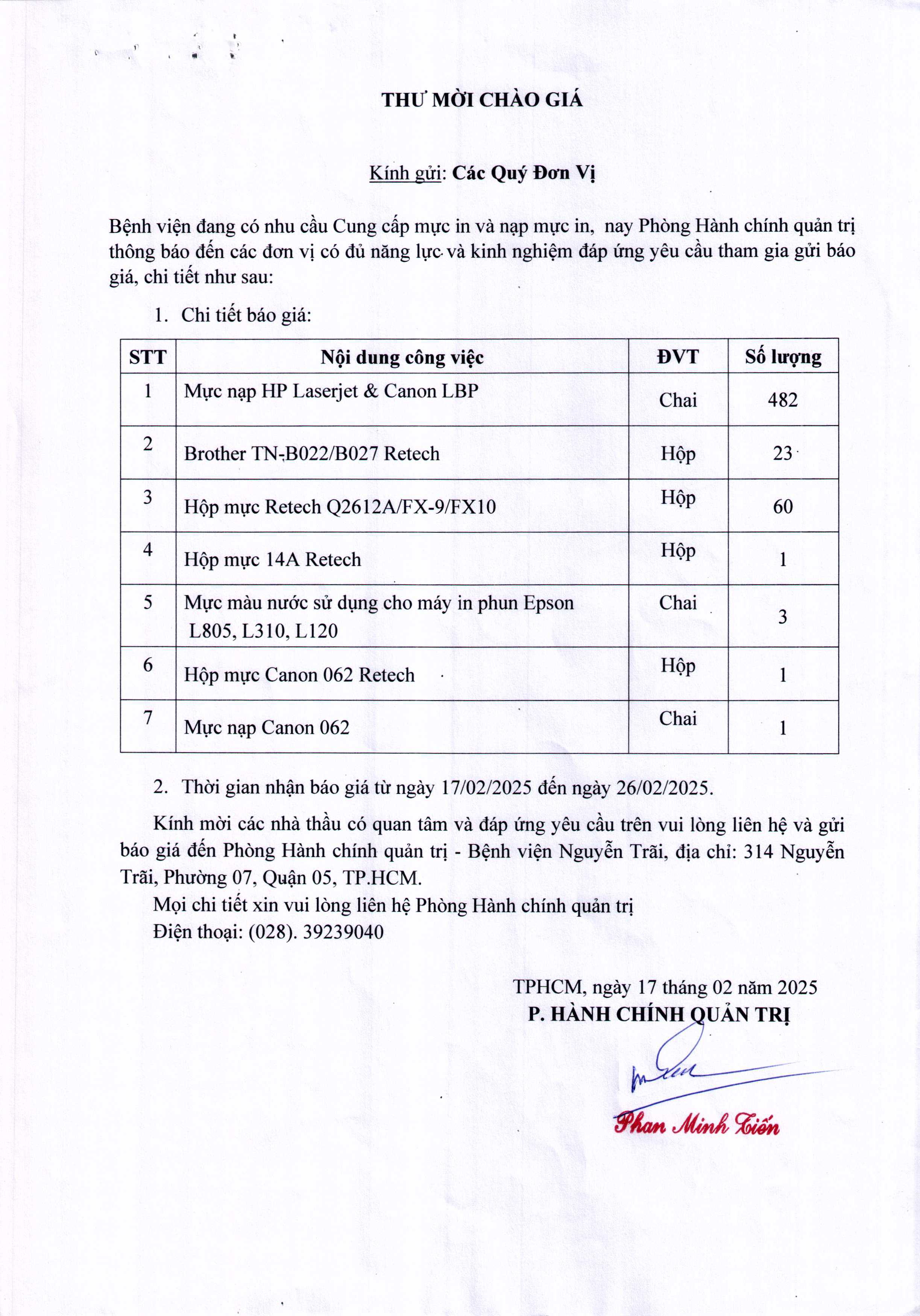 Thư mời chào giá Cung cấp mực in, nạp mực in