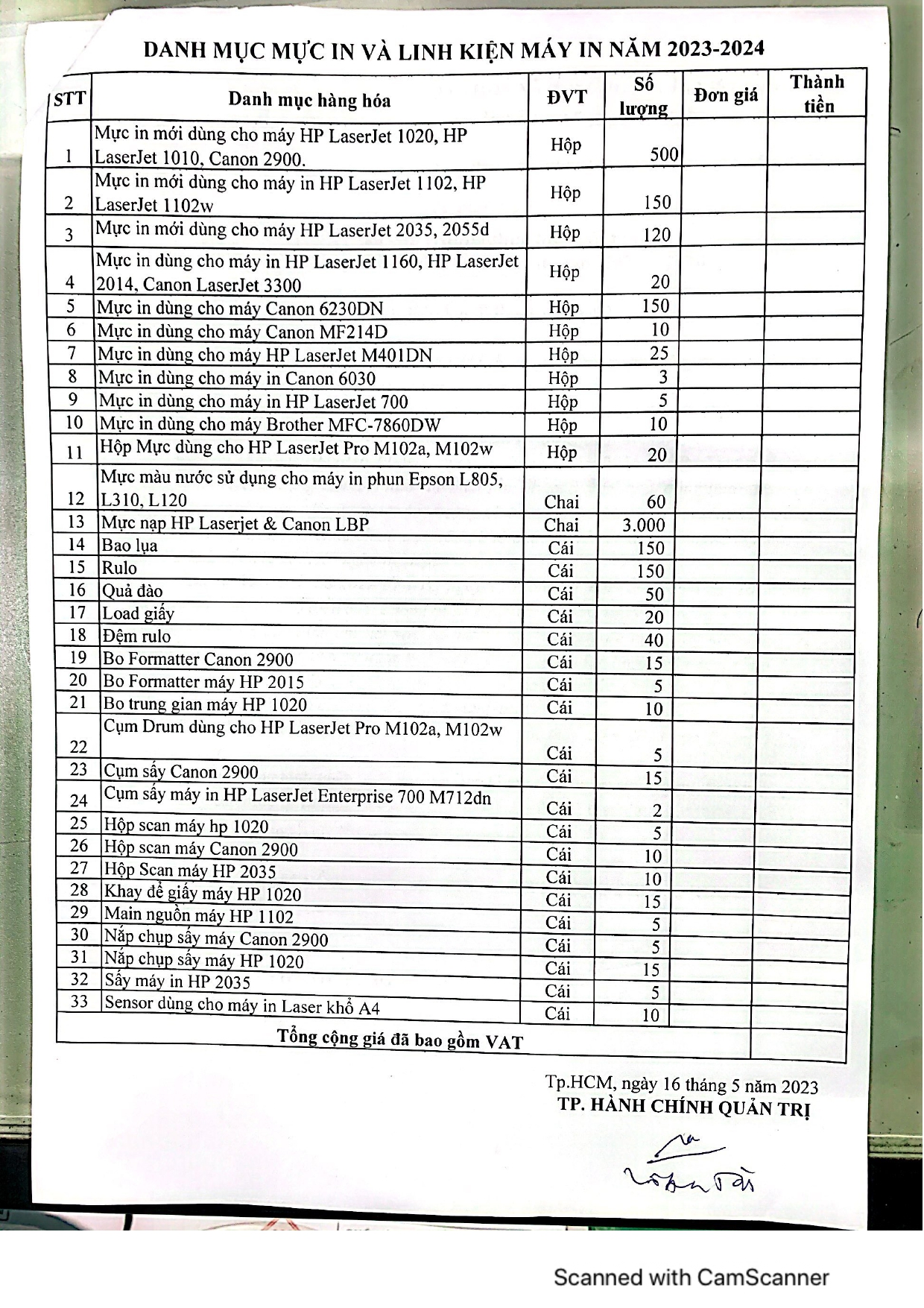 Thư mời chào giá cung cấp mực in và linh kiện máy in năm 2023-2024